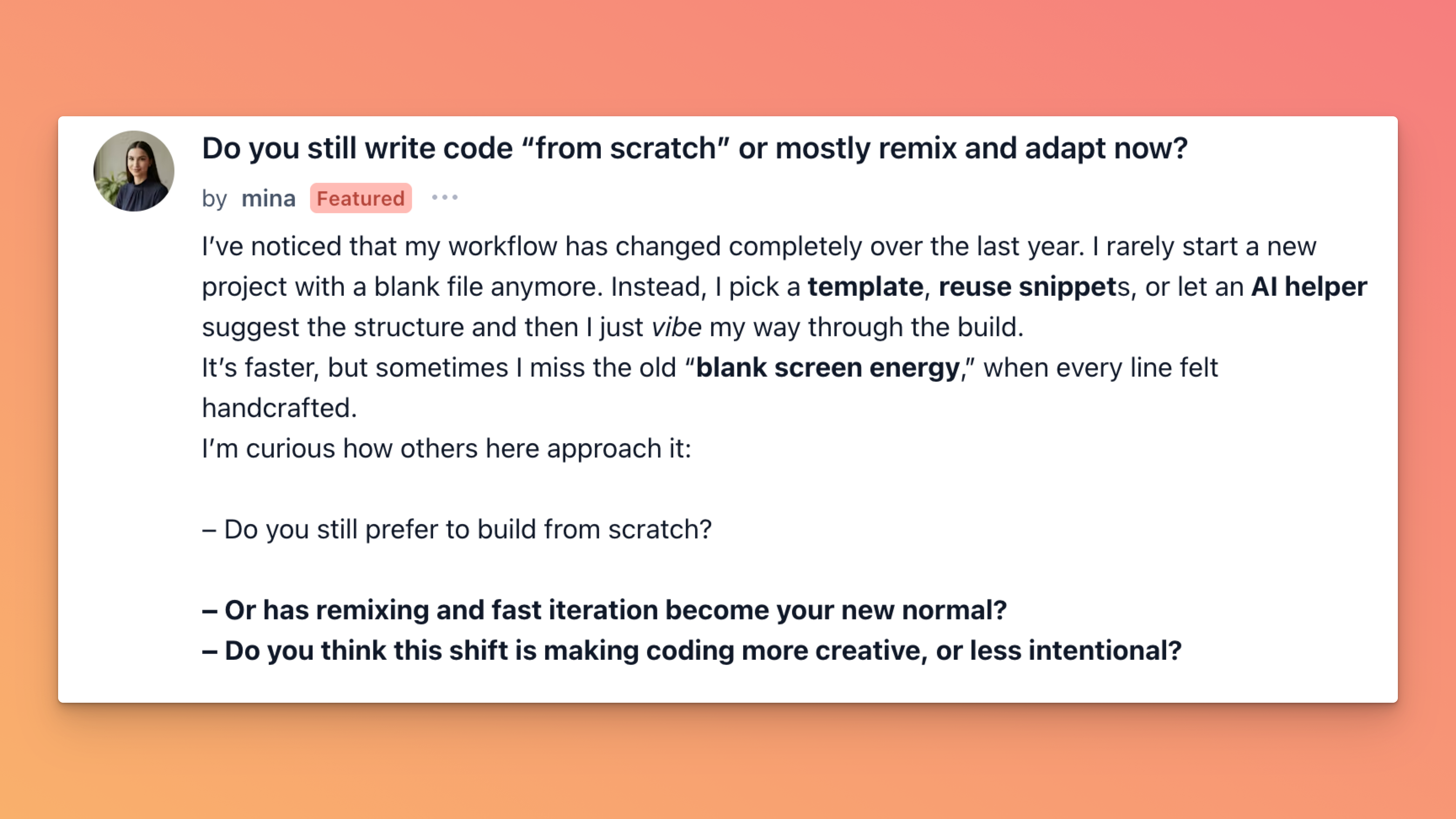Mina kicked off a surprisingly honest thread about how coding feels different in 2025. She said she almost never starts from a blank file anymore. Templates, snippets, AI-suggested structures hae become her default flow. It’s fast, sure, but she admits she sometimes misses that “blank screen energy” where every line felt intentional.