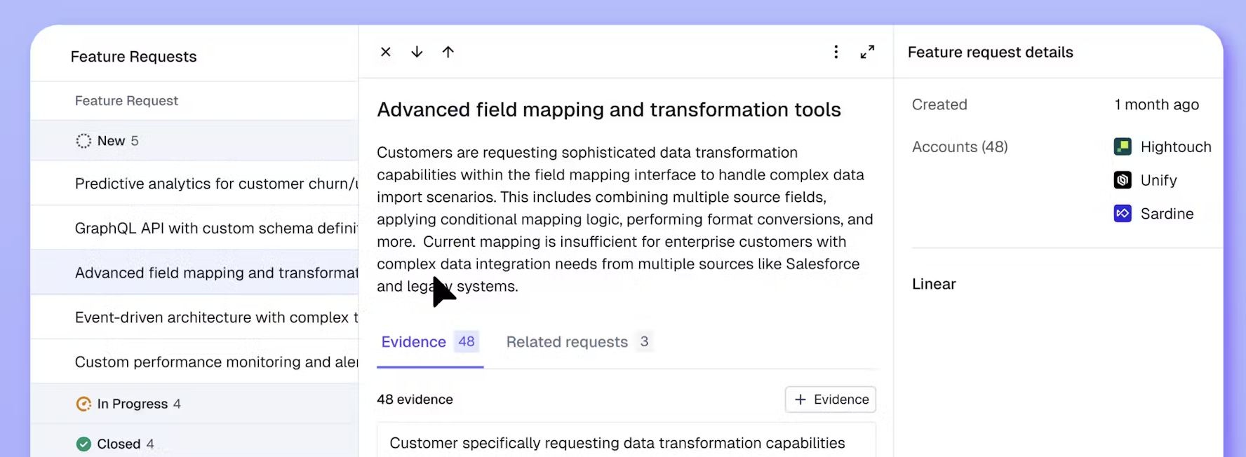 Product Intelligence pulls feature requests out of your support inbox, Slack threads, emails, and whatever other channels your team swears they’ll “get to later.” It groups them, tags them, and shows real evidence so PMs don’t have to hunt people down asking who remembers why something was requested in the first place.