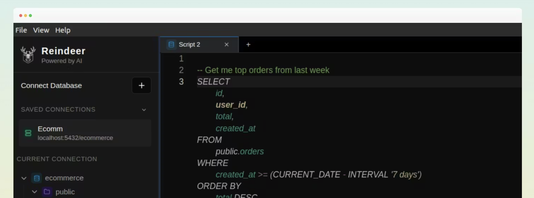 Reindeer is a Cursor-like IDE for databases. It understands your database schema, generates production-ready SQL in seconds, autocompletes, and fixes without ever leaving your IDE. The point being to get developers to stop context switching when moving from writing code to writing queries.Â