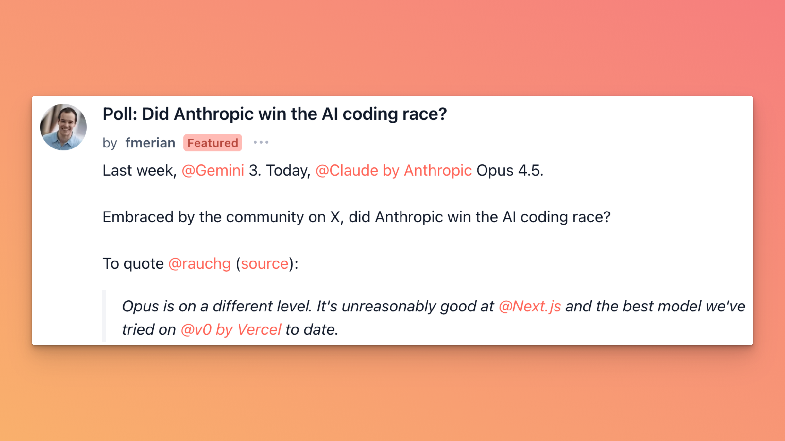 fmerian started a thread asking: “Did Anthropic win the AI coding race?” He points out how the latest Claude release from Anthropic has stirred things up, and now the community’s weighing in — not just on benchmarks, but on what “winning” even means in this space.