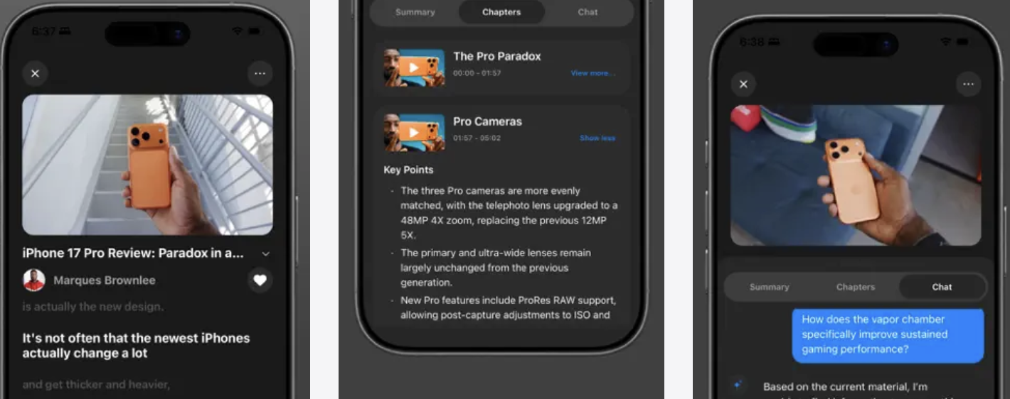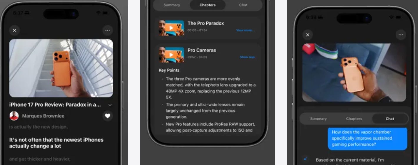 InsightTube takes regular YouTube videos and gives you the parts you actually need. You search inside the app, open a video, and it pulls out the ideas, the chapters, translations, and lets you ask questions about what’s being explained. You can save the processed version and jump back to the moments that mattered instead of guessing where something was said.