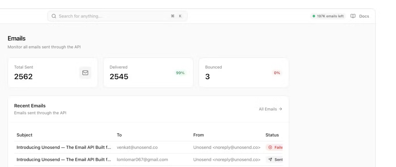 Unosend is an email API for transactional and marketing sends in one place. REST endpoint, sane dashboard, logs, webhooks, custom domains, and a free tier that does not require a math degree to understand.