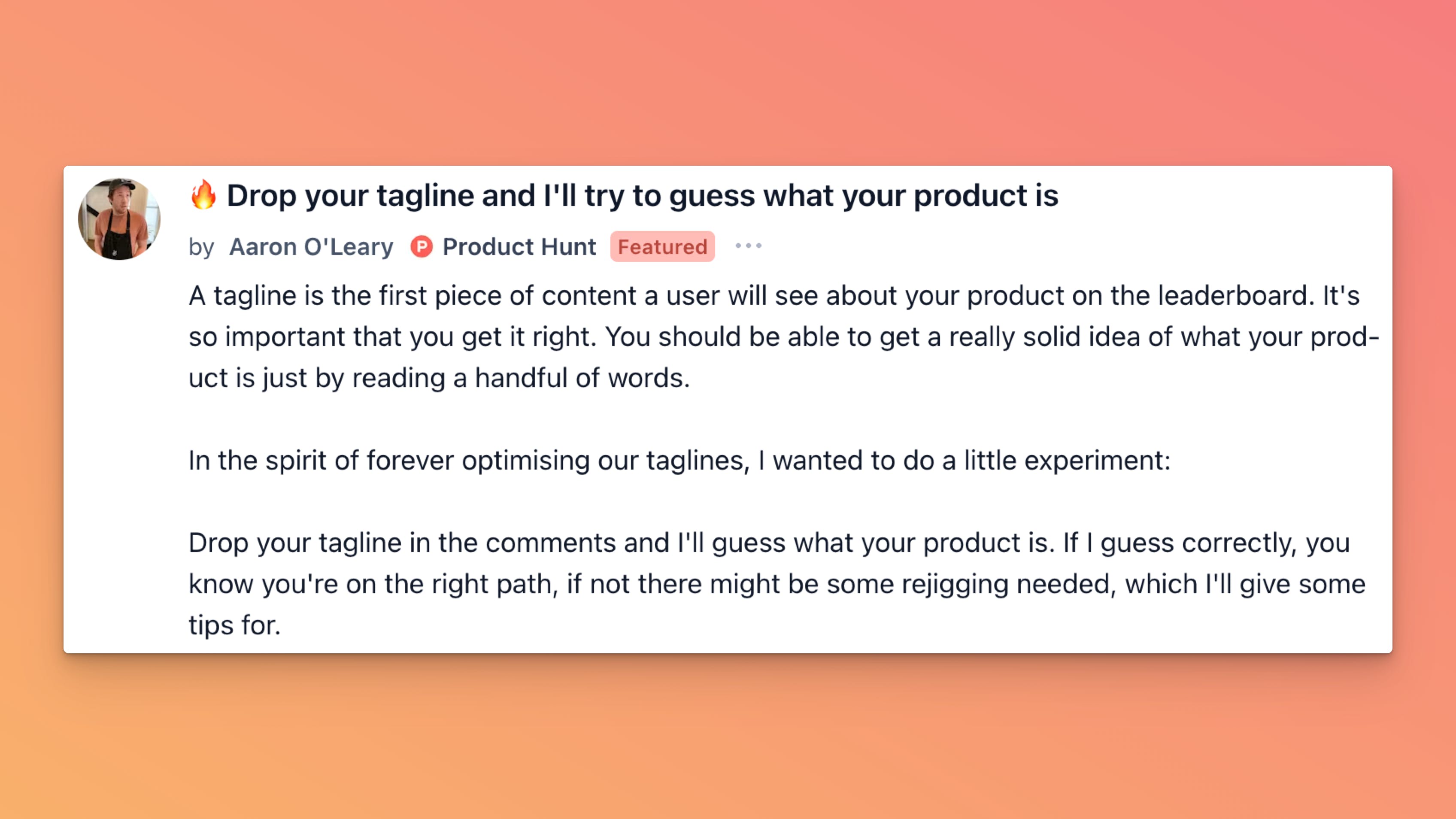 Aaron started a thread for anyone stressing over their Product Hunt tagline. He points out itās the first thing people see on the leaderboard, so it should basically tell you what the product is in a handful of words.
