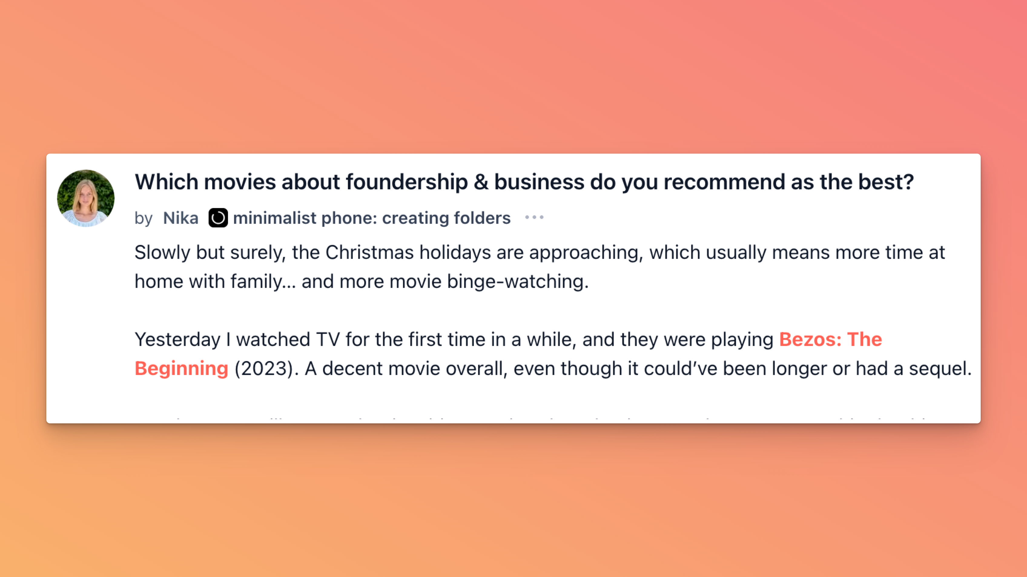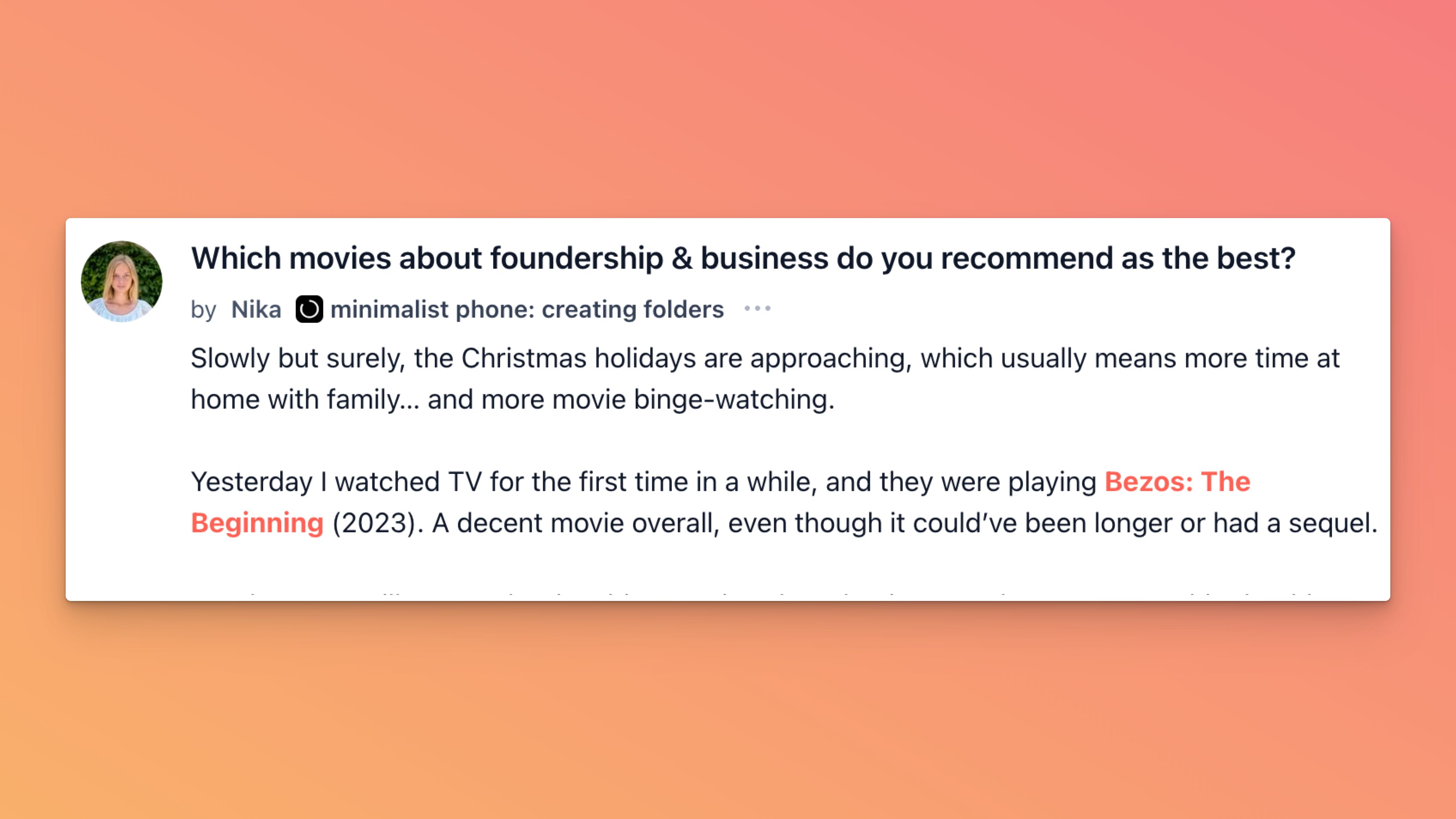 Nika started a thread with a simple holiday problem: more couch time is coming, and she wants founder-ish movies that actually inspire instead of just filling the background. She mentions catching āBezos: The Beginningā on TV, plus heavier hitters like āThe Social Network,ā āThe Big Short,ā and a Jobs vs. Gates documentary, then asks what else belongs in that corner of the watch list.