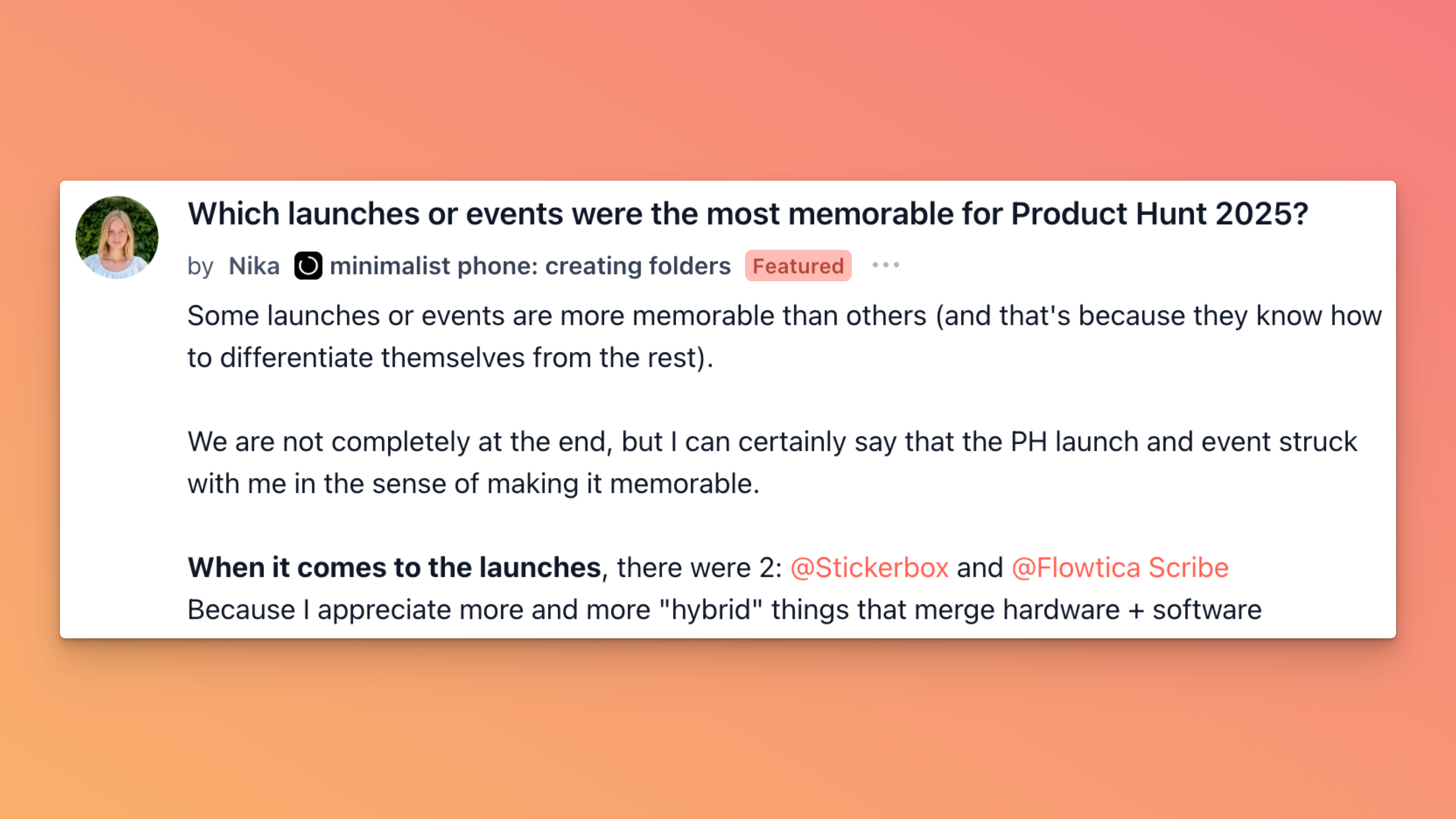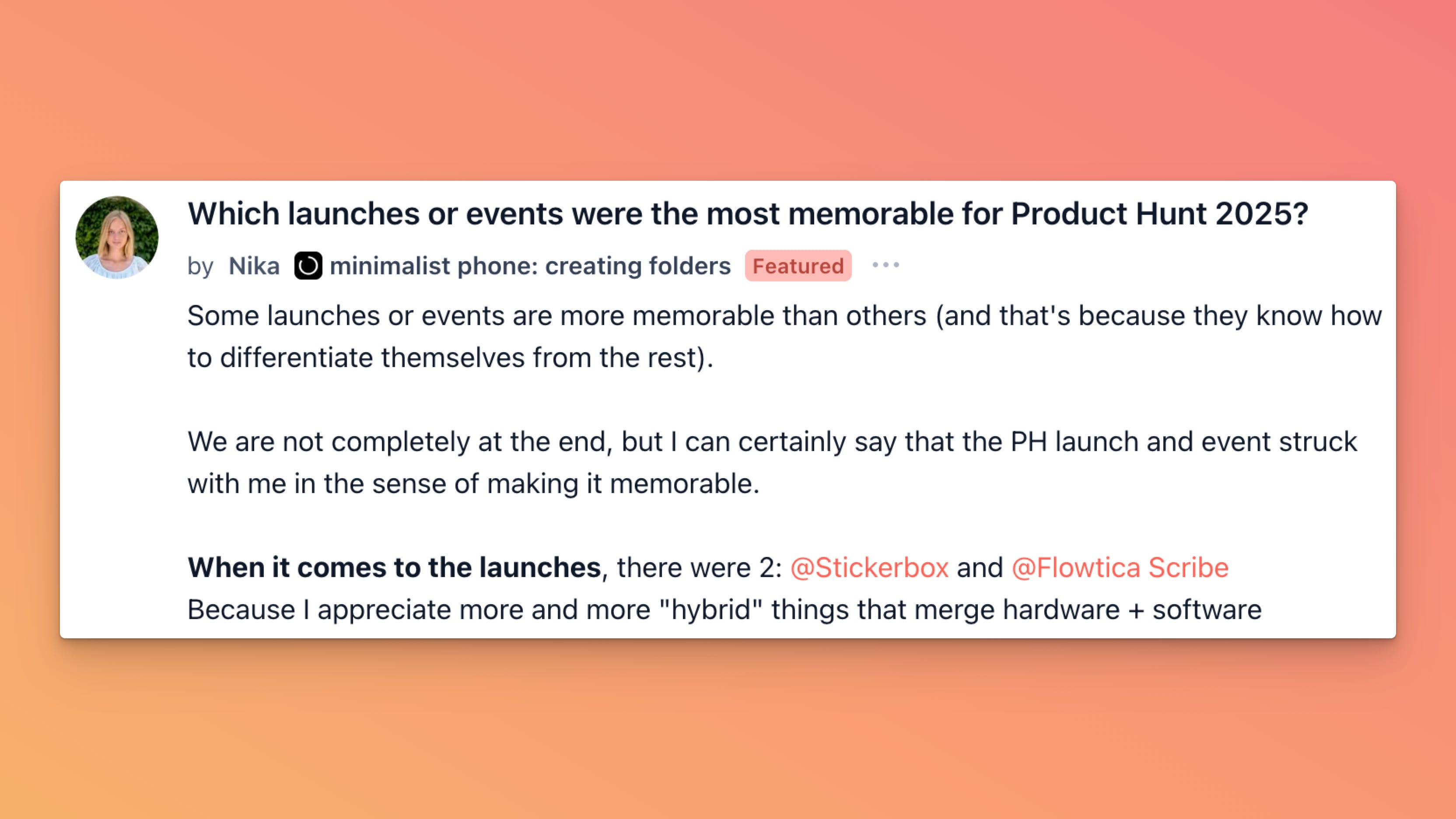 Nika opened a thread about the launches and events that actually stayed in people’s heads this year, not just whatever hit the front page. She calls out two in particular – Stickerbox and Flowtica Scribe – because she loves “hybrid” things that mix hardware and software, and points to the cancellation of the old “Notify me” page as a surprisingly memorable platform moment. Now she’s asking everyone else which launches or changes on Product Hunt felt genuinely memorable in 2025 and why.