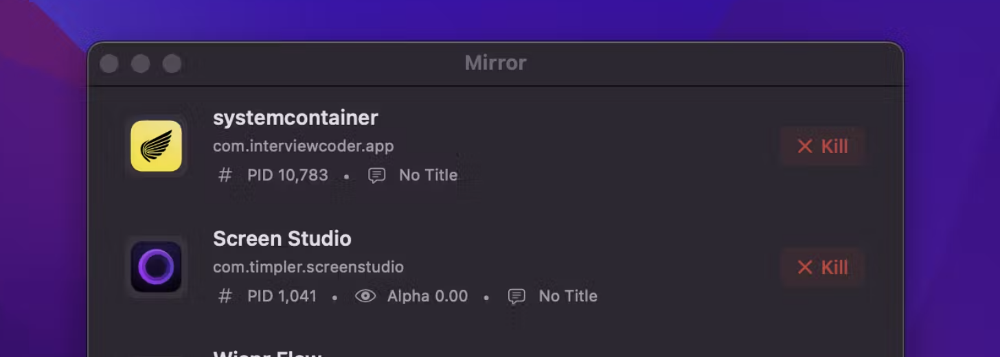 Mirror is a macOS utility that finds background apps that deliberately stay out of Activity Monitor, including stealth tools like Interview Coder, Cluely, Hiding AI and similar. It shows you what is actually running, highlights software designed to be invisible, and lets you decide what stays. Everything runs locally and it’s open source, so you can check how it works yourself.
