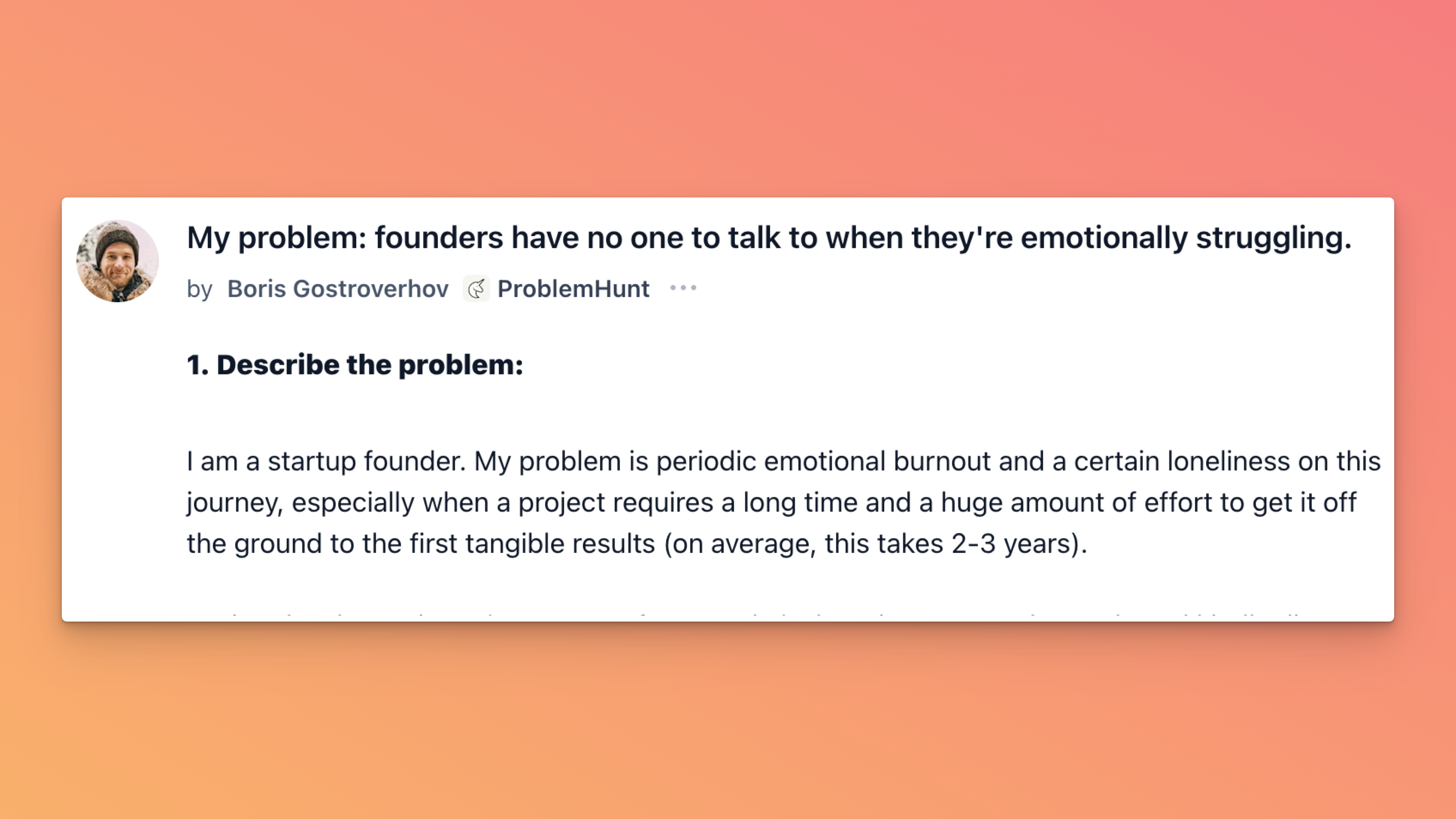 Boris Gostroverhov, founder of ProblemHunt, last month shared his story of spinning a decade of startup failures into success. Across a decade of trial and error, he launched 18 different products. What he didn’t share was the loneliness and emotional burnout that would bubble up every few months.
