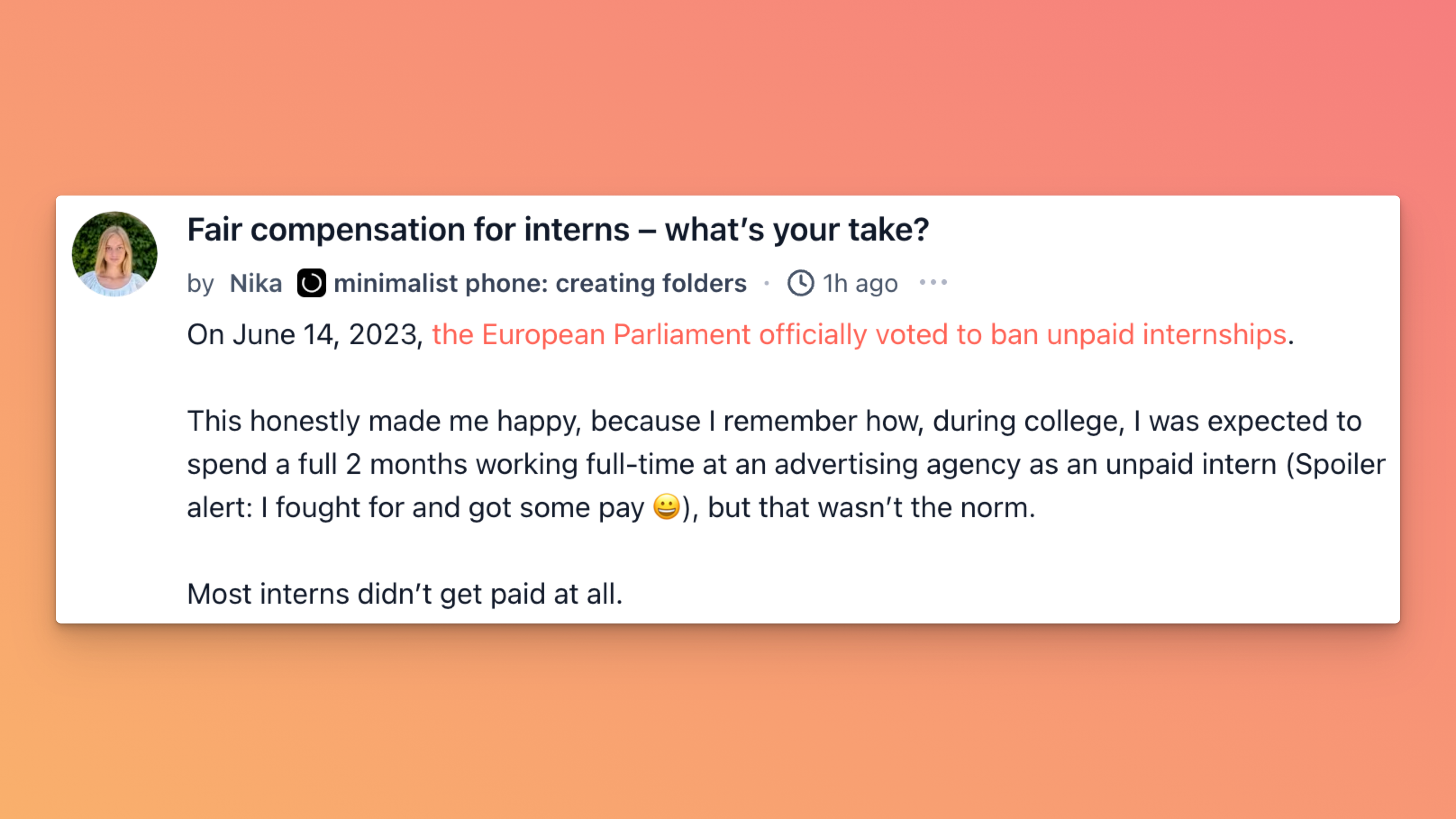 Nika opened a thread reacting to the EUâs move to ban unpaid internships and her own experience of being expected to work two full-time unpaid months at an agency. Sheâs torn between knowing some students donât add much value at first and still feeling that peopleâs time should be rewarded, and asks where others land on paid vs unpaid and what âappropriateâ comp looks like. The top reply pushes back on blanket bans, saying interns often cost real time and attention to train and that simple âwe teach, you helpâ setups can work, but only if both sides stay honest about the trade.