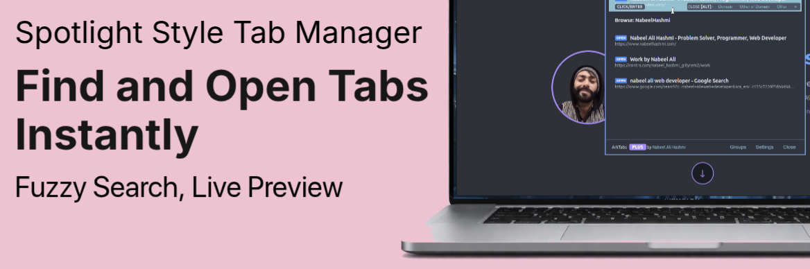 ArkTabs is a Spotlight-style tab manager for your browser. Hit Alt + P to fuzzy search across open tabs, bookmarks, history, recently closed sessions and custom workspaces, with live previews and an omnibar for web search and direct navigation.