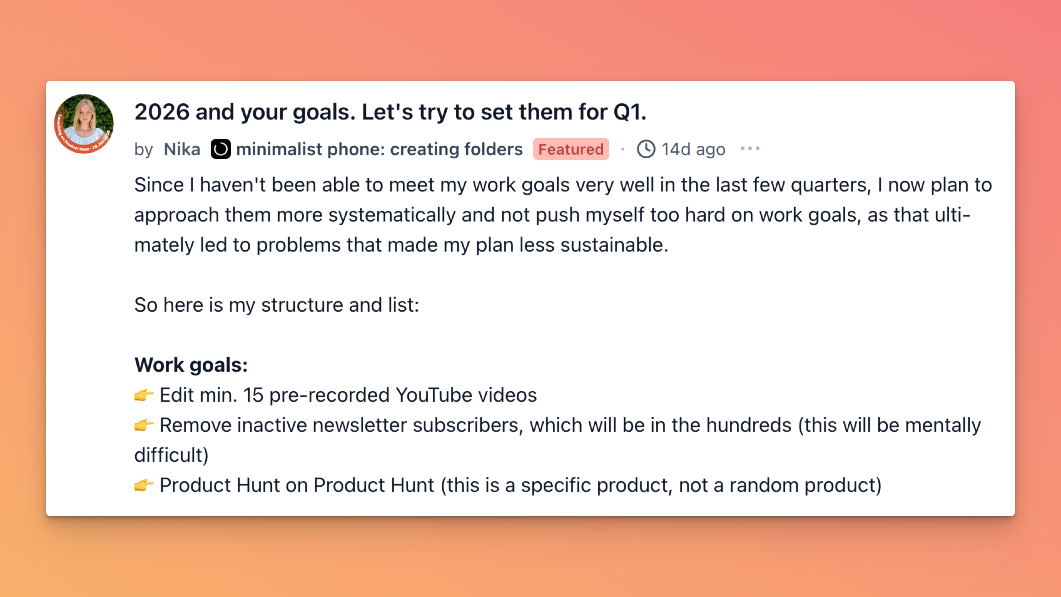 Nika kicked off a thread admitting she has not been hitting her work goals lately, so for Q1 2026 she is going a bit more structured and a bit less self-punishing. Her plan is split cleanly: work goals like editing 15 pre recorded YouTube videos, cutting inactive newsletter subscribers, and shipping a specific Product Hunt launch, plus personal goals like consistent exercise, learning four languages, eating fewer sweets, and actually going to bed before midnight.