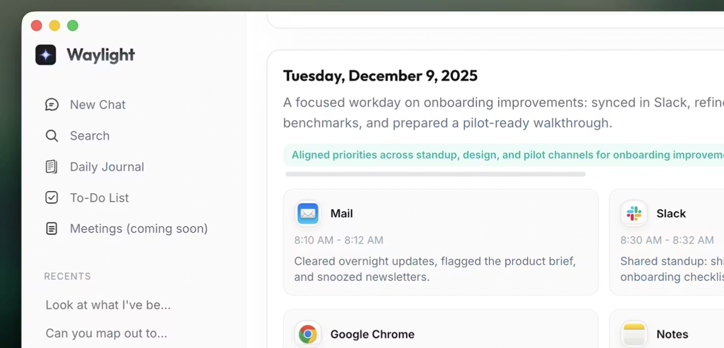 Waylight for macOS is an AI assistant that actually remembers what you do on your computer. It watches your meetings, docs, tabs and messages locally, then lets you ask what you agreed to in a call, to summarize the PDF you had open, or to find that article you were reading last week. It also builds a running to do list and daily journal from your activity, all on device, not in someone else’s cloud.