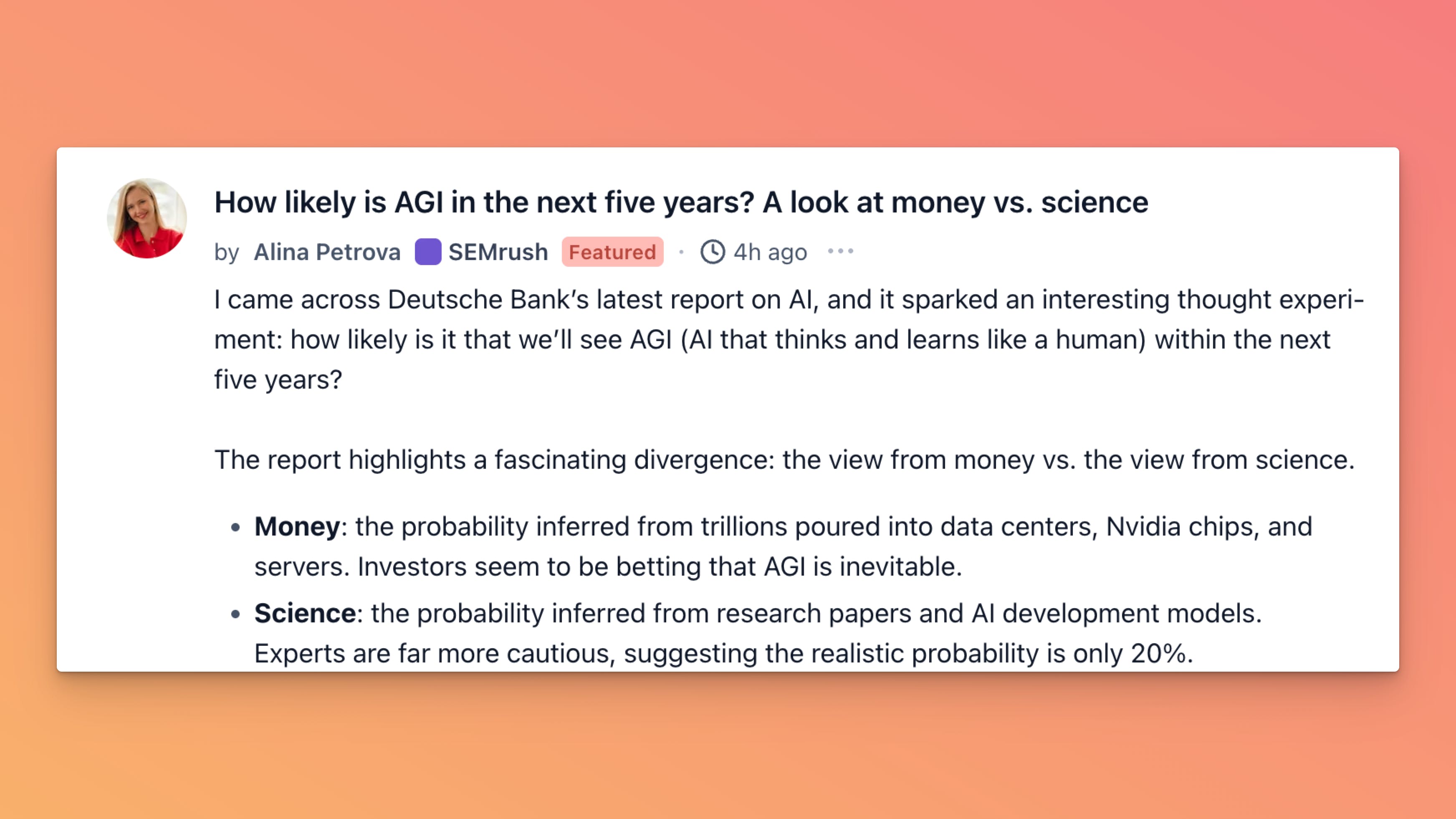 Alina Petrova kicked off a thread after reading a Deutsche Bank report that puts numbers on something everyone argues about anyway: how likely AGI is in the next five years.