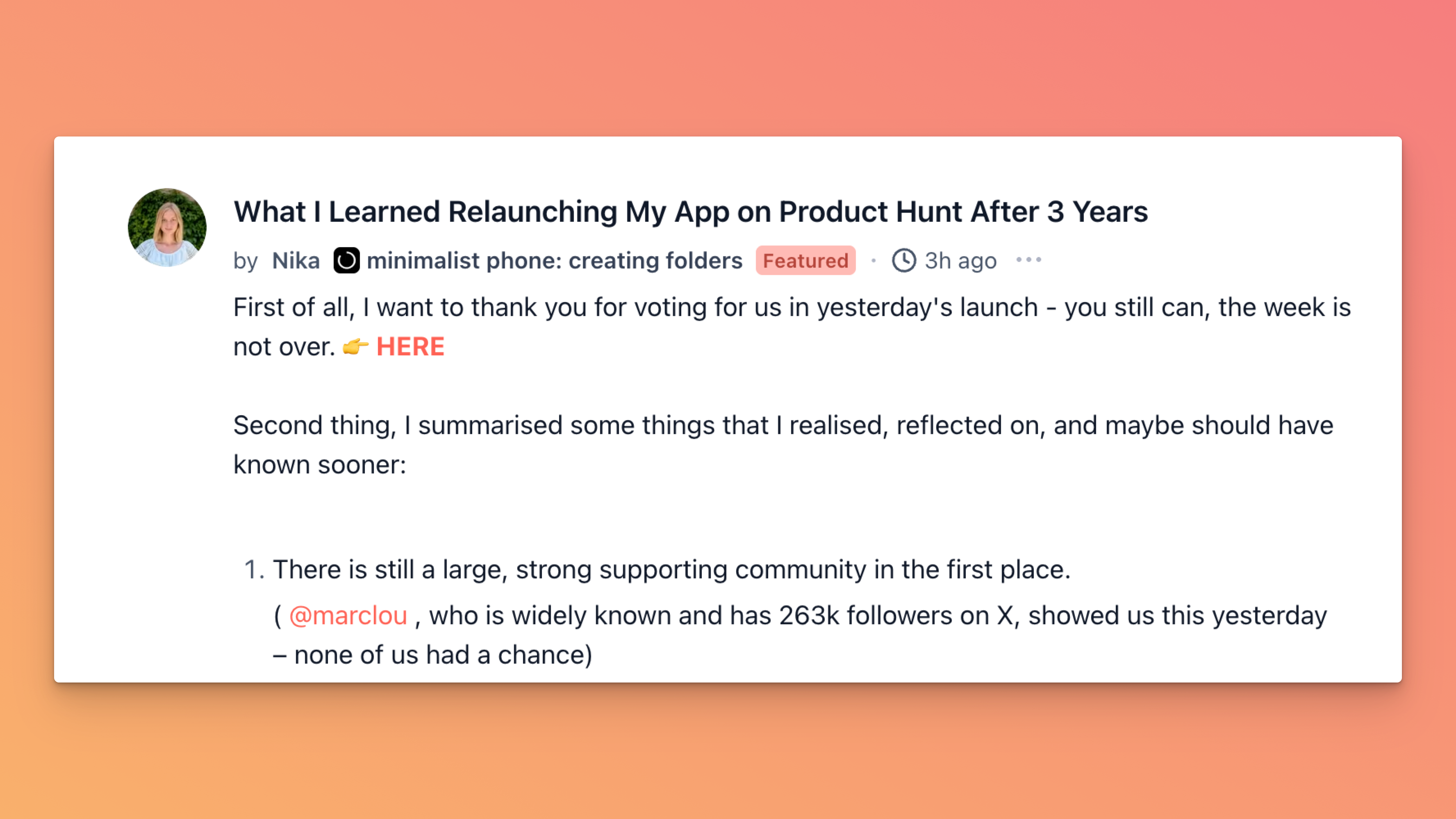 Nika shared a debrief on relaunching Minimalist Phone after three years of zero hunting and landing 6th on a pretty stacked day. Her takeaways: the Product Hunt community shows up strong if you’ve built relationships.