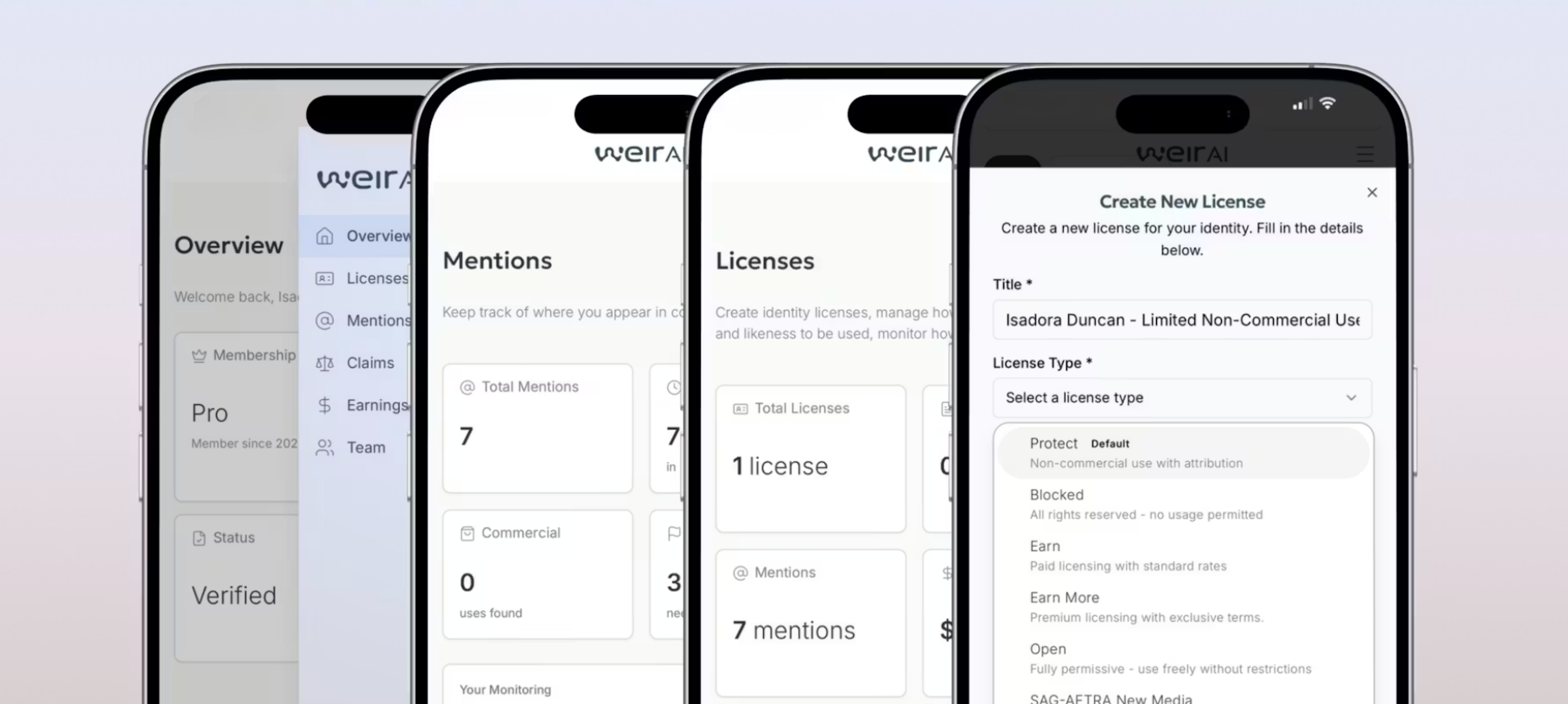 WEIR AI tracks where your name, face, and public identity show up online so you can actually see what is out there. You can monitor mentions, including hidden ones, run a public identity checkup, set your terms, and either file claims or license your identity on your own terms. It is built as a privacy first platform, not a scrape now panic later situation.