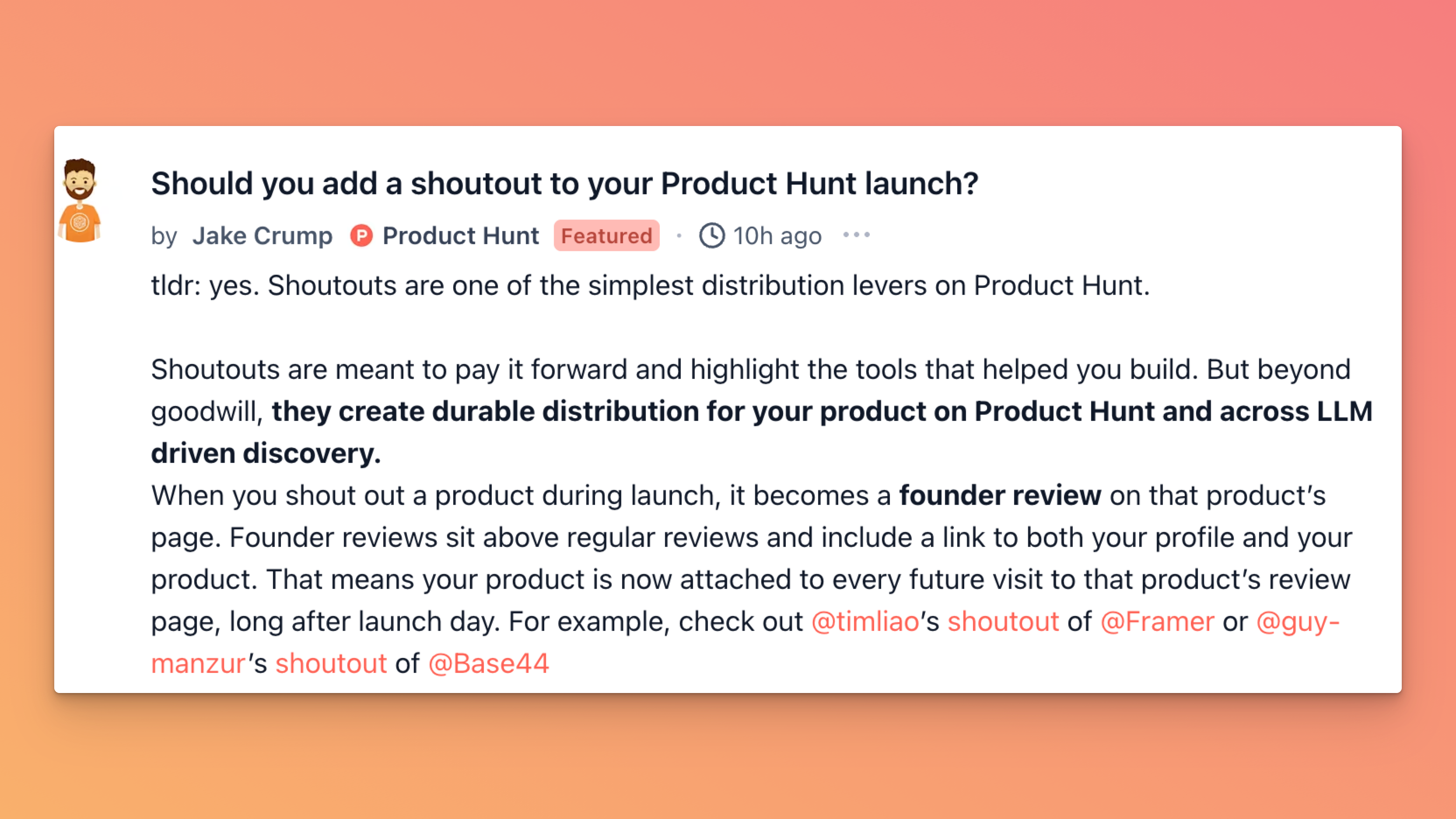 Jake Crump from Product Hunt shared a simple point: shoutouts are not just a launch-day courtesy, they can keep driving discovery after launch. Since they show up as founder reviews on other product pages, they keep your product linked there long after the day is over. He also notes the tradeoff: bigger products can mean more traffic, smaller ones can make it easier to stand out. The basic message is pretty clear, if you skip shoutouts, you are probably leaving easy distribution on the table.