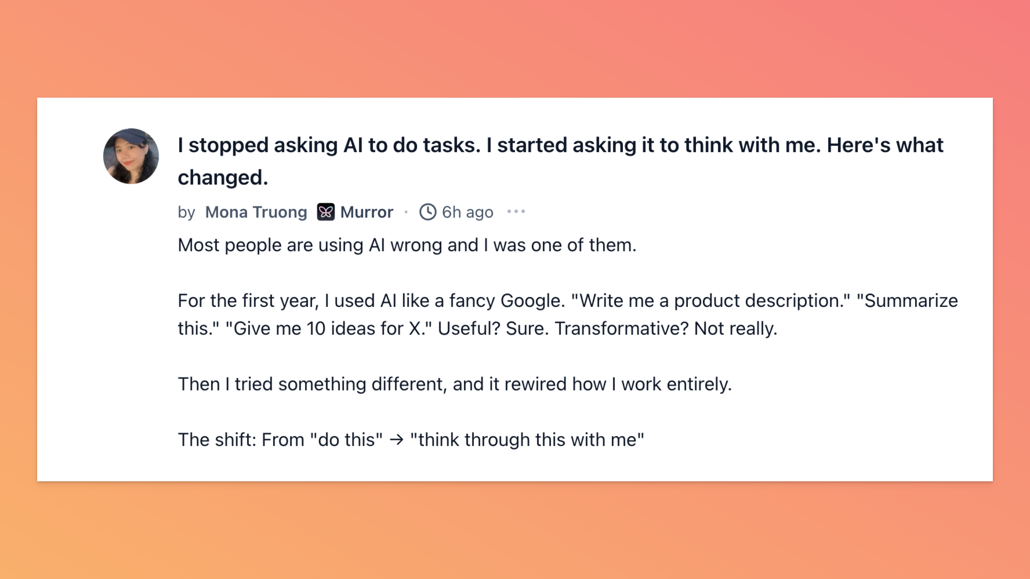 Mona shared a post about a small shift in how she uses AI, and it is the kind of thing that instantly makes your own workflow look a little lazy. The idea is simple: stop treating AI like a task machine and start using it to stress-test your thinking. Less doing the work for you, more poking holes in your logic before you ship something half-baked.