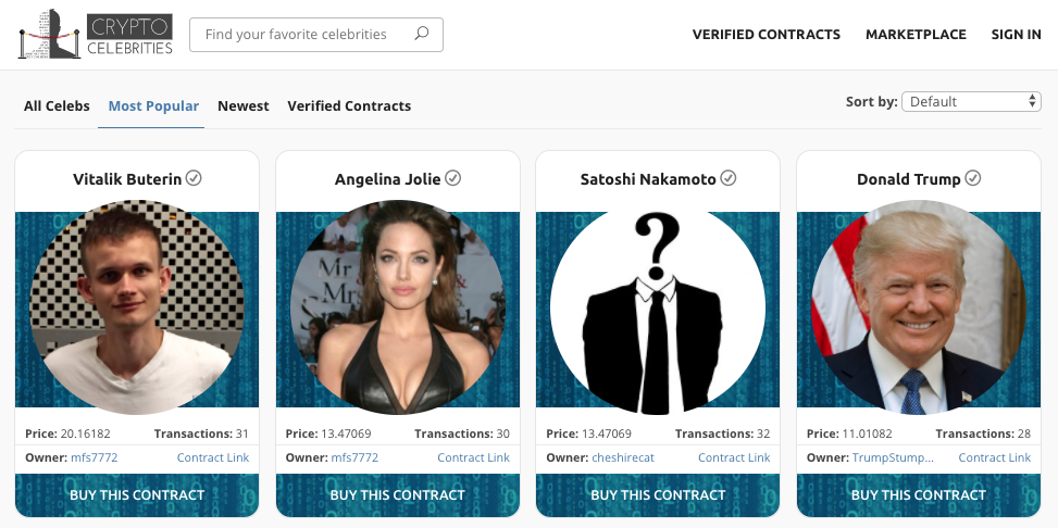 The next big blockchain game is here. It’s called CryptoCelebrities. Users have spent over million dollars in Ether (!!!) “buying” celebrities in the first 24 hours of the game’s launch. The most popular celebrity smart contracts are selling for several thousands of dollars (worth of Ether).