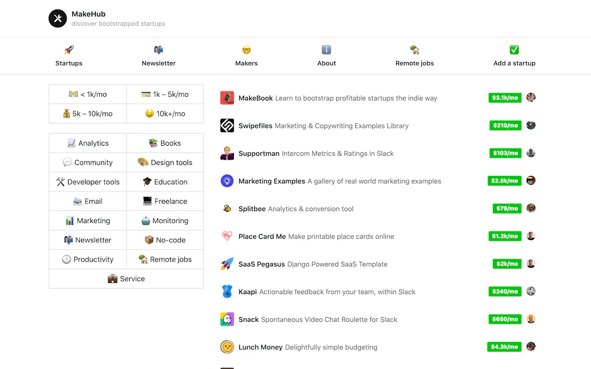 MakeHub features profitable micro-startups built by solo founders without funding.