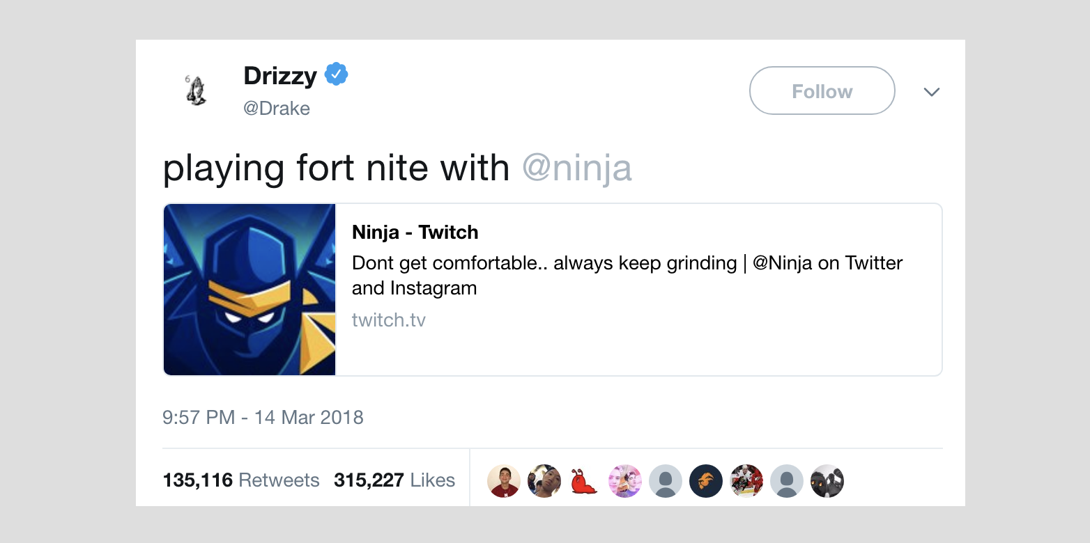 On Wednesday night, Degrassi's Drake and Travis Scott joined adored streamer Ninja to play Fortnite. 628,000 tuned in to watch on a random Wednesday night, crushing Twitch's all-time streaming record.