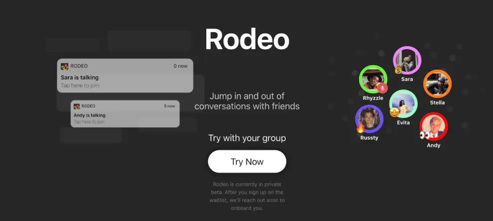 Earlier this week Midas Kwant launched Rodeo, an app for casual voice-only (no need to check how you look) chats with friends - no calendar invite necessary.