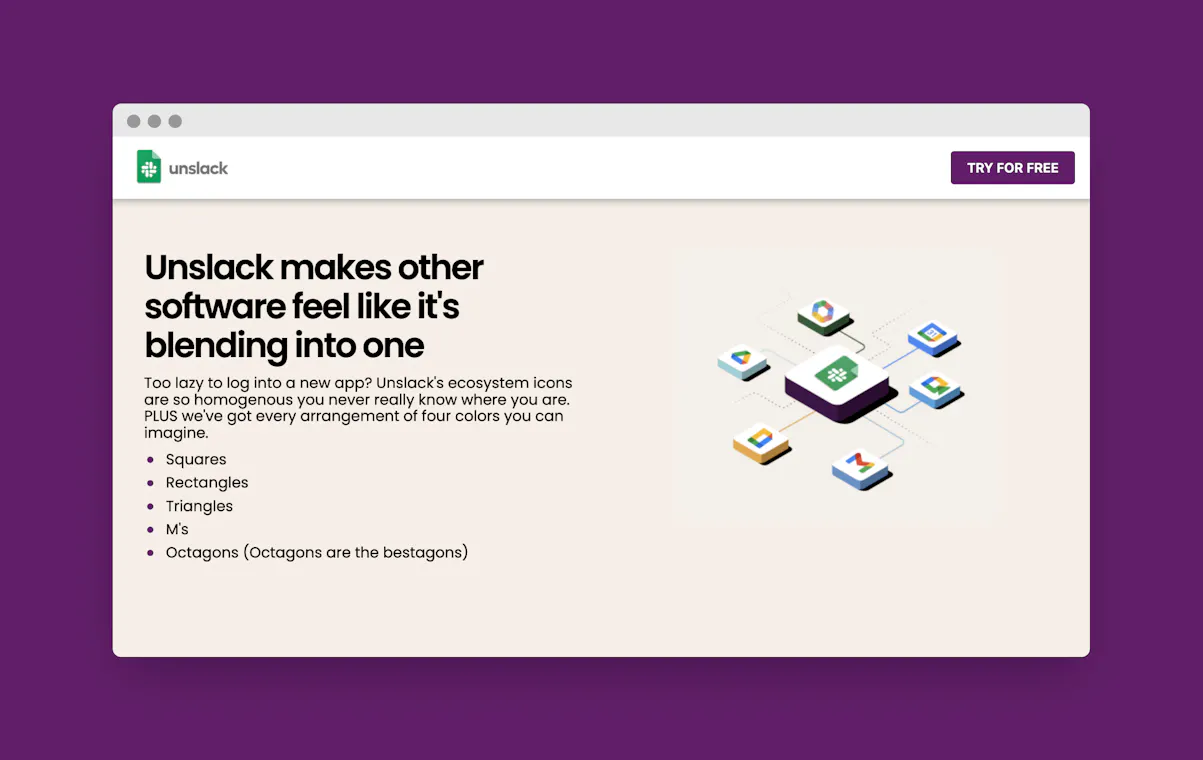 Described as “the Slack we deserve, not the one we need,” unslack wants you to think of a world of where Slack operates in Google sheets. 🥴