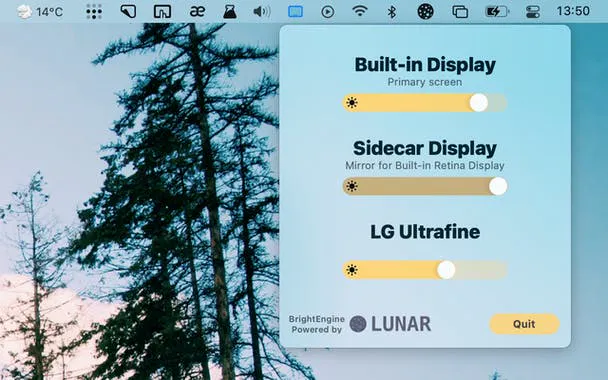 - Lunar Lite adds slides to your menu bar to dim the brightness of monitors, wireless displays, iPad Sidecar, and AirPlay.