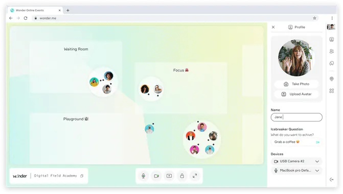 Wonder 2.0: “[O]ur focus is not on making the spaces more immersive or complex, but facilitating interaction between participants… Wonder helps surface commonalities between users. We use icebreaker questions [and are] working on statuses that are searchable so that guests can find people interested in similar things.”