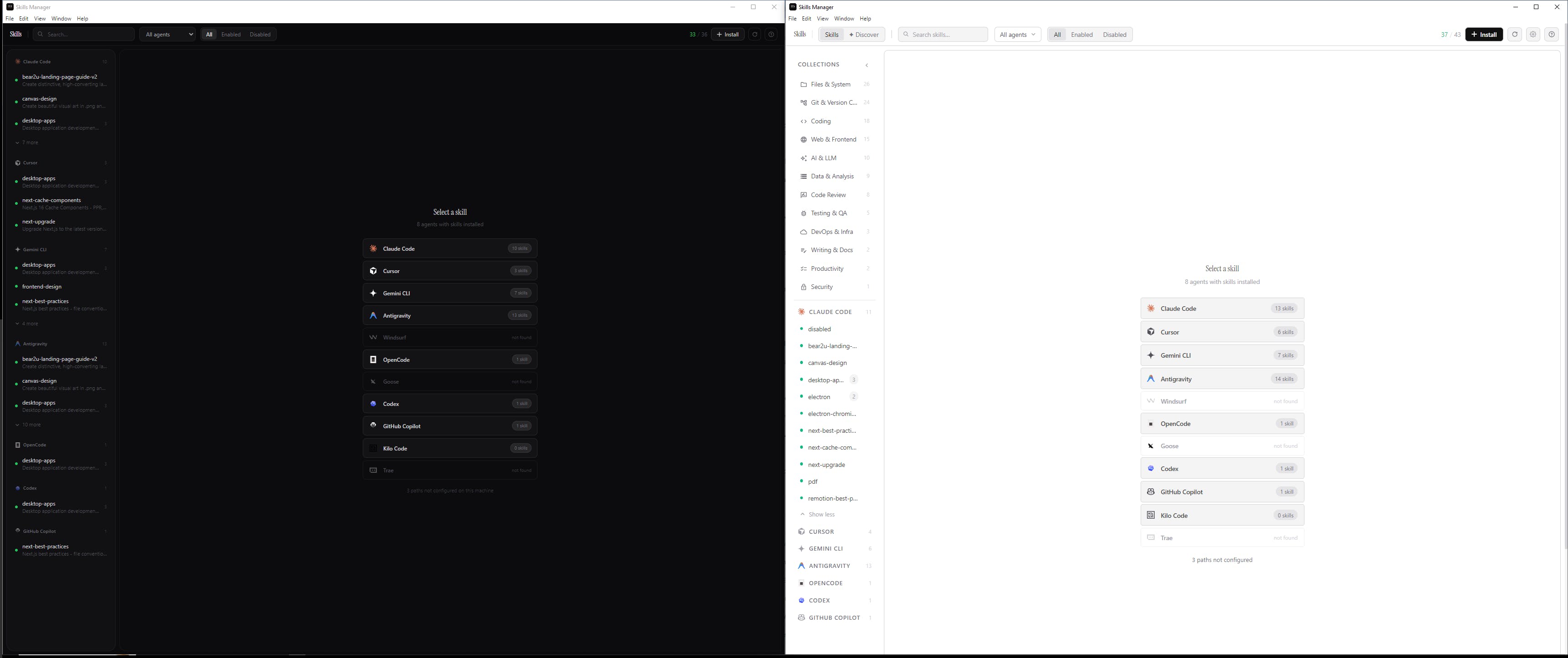 🗂 Smart Collections — Skills auto-categorize by domain (Coding, Git, DevOps, Security, AI…) with no setup needed.