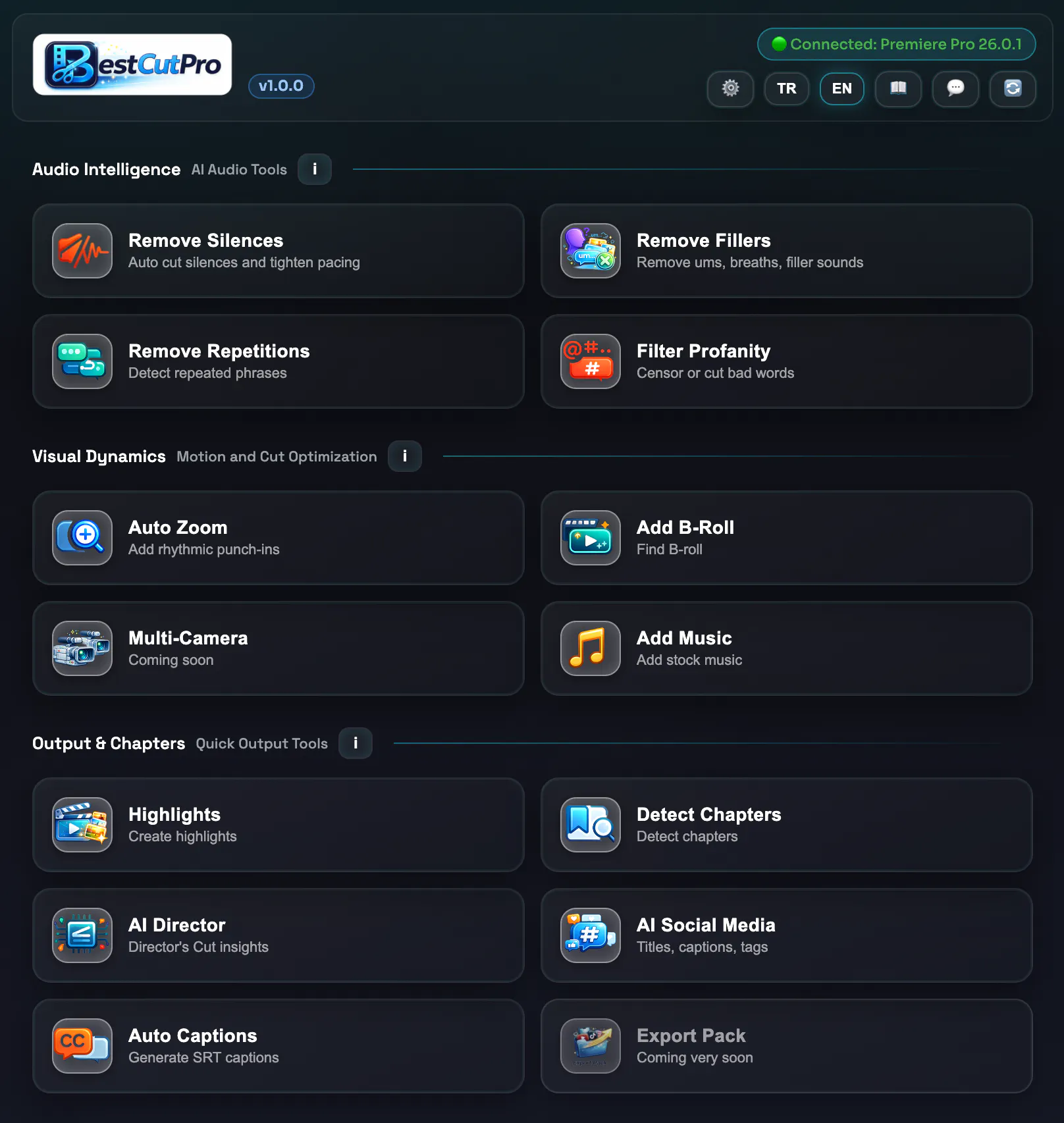 This application we've developed is an advanced plugin for all users, from beginner to advanced. It has all the tools you need for quick editing. Features include removing silent areas in your video, quickly adding subtitles, and creating AI-powered video titles and content, among 10 other features you might need. As a video editor, I highly recommend you take a look.