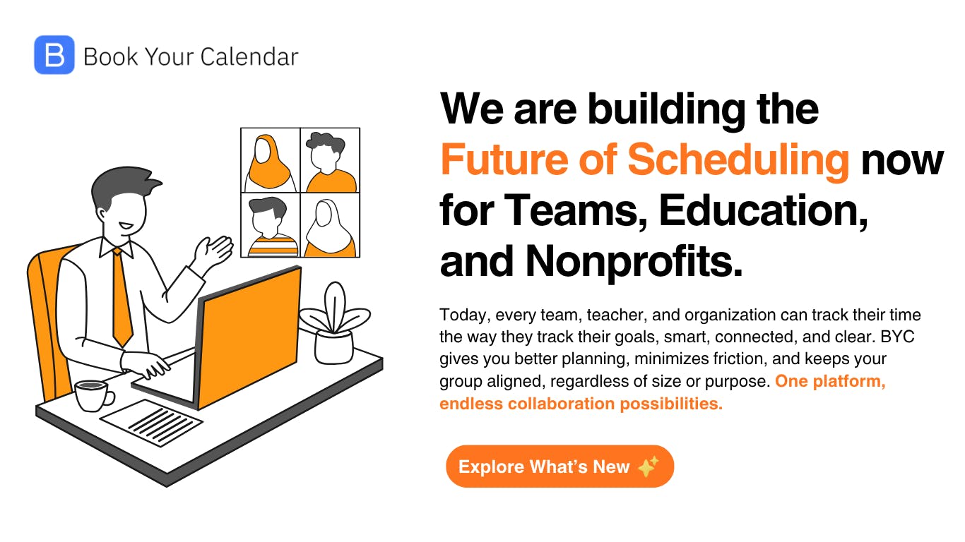 Today, we launched Book Your Calendar (BYC), a brand new version for Teams, Educators, and Nonprofits that plan, organize, and work together on a day-to-day basis.