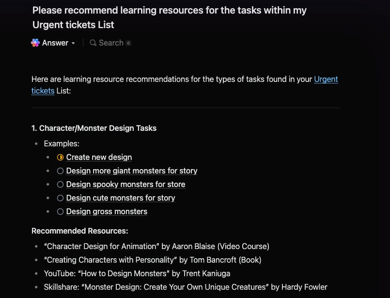 @samanvaya_pant Yes, it can! You can ask about your Lists, tasks, Docs, and more! Since Brain Max can web search, it'll be able to share learning resources across the web, as shown in the screenshot below: