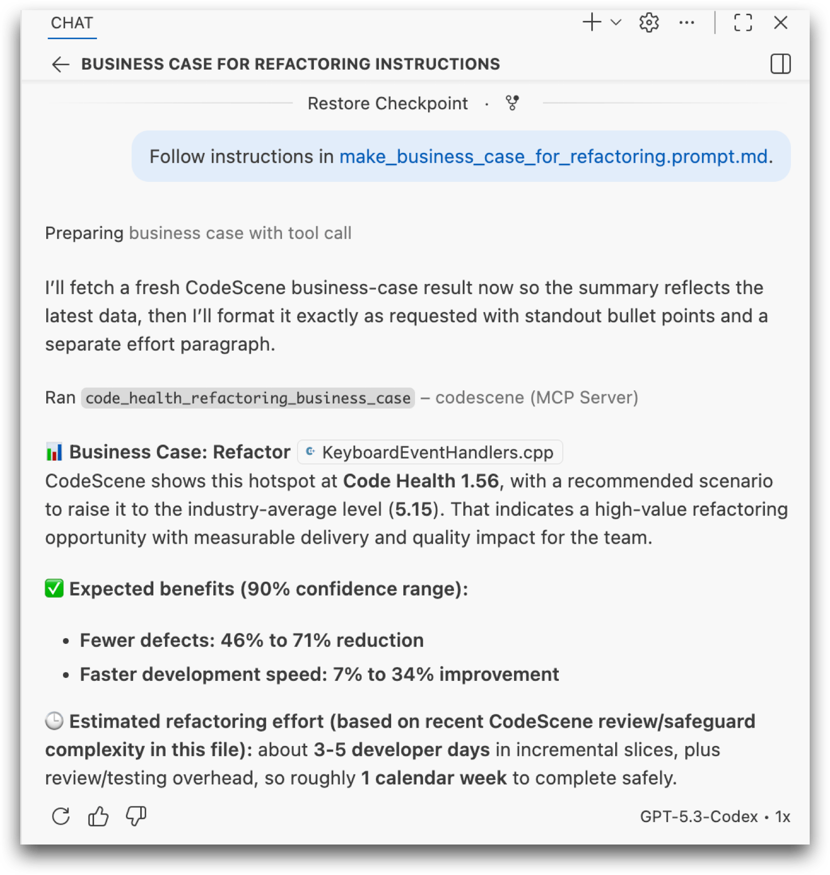 @romanela_p One of the shortcomings of many engineers is that they struggle with quantifying important engineering aspects into business impact and thus often fail to convince their managers to green light some important refactoring work. The CodeHealth MCP's code_health_refactoring_business_case tool solves that problem entirely.