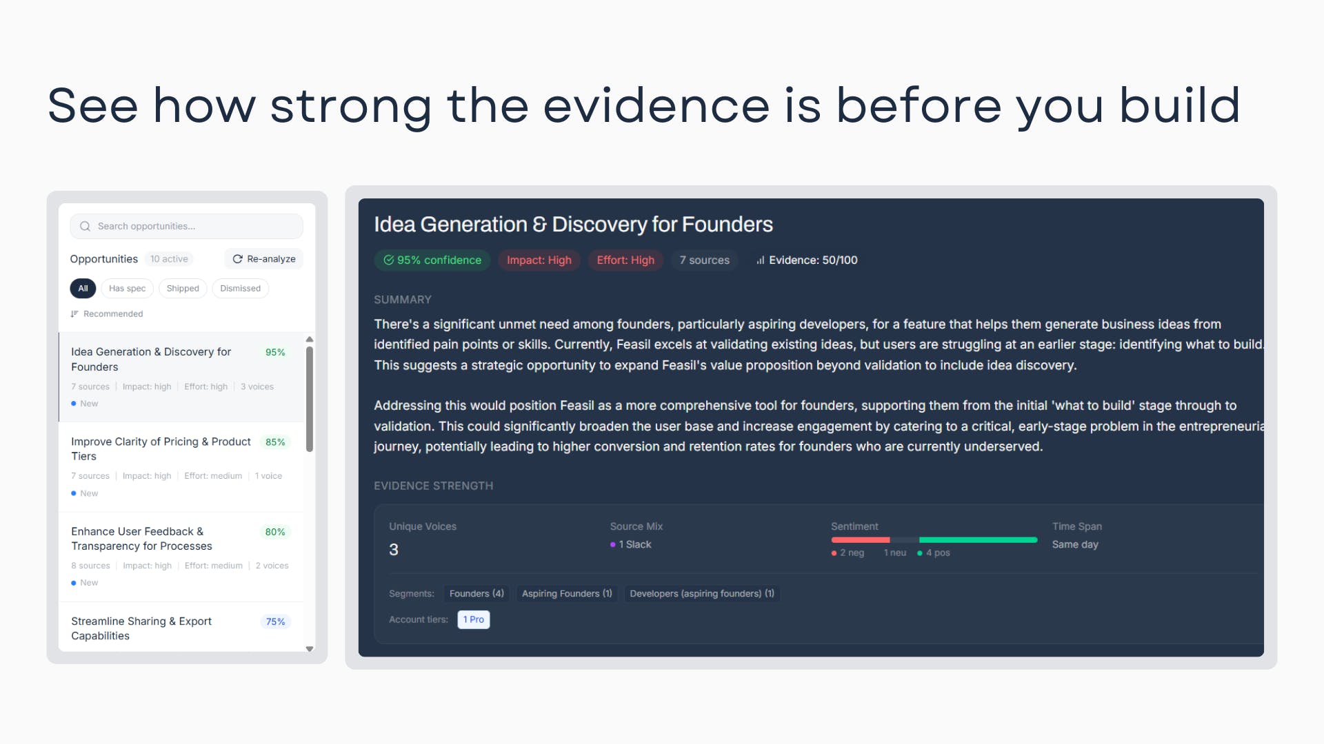 Every opportunity now shows an Evidence Score from 0 to 100. You can see how many unique voices mentioned it, which sources it came from, sentiment breakdown, and which customer tier is asking.