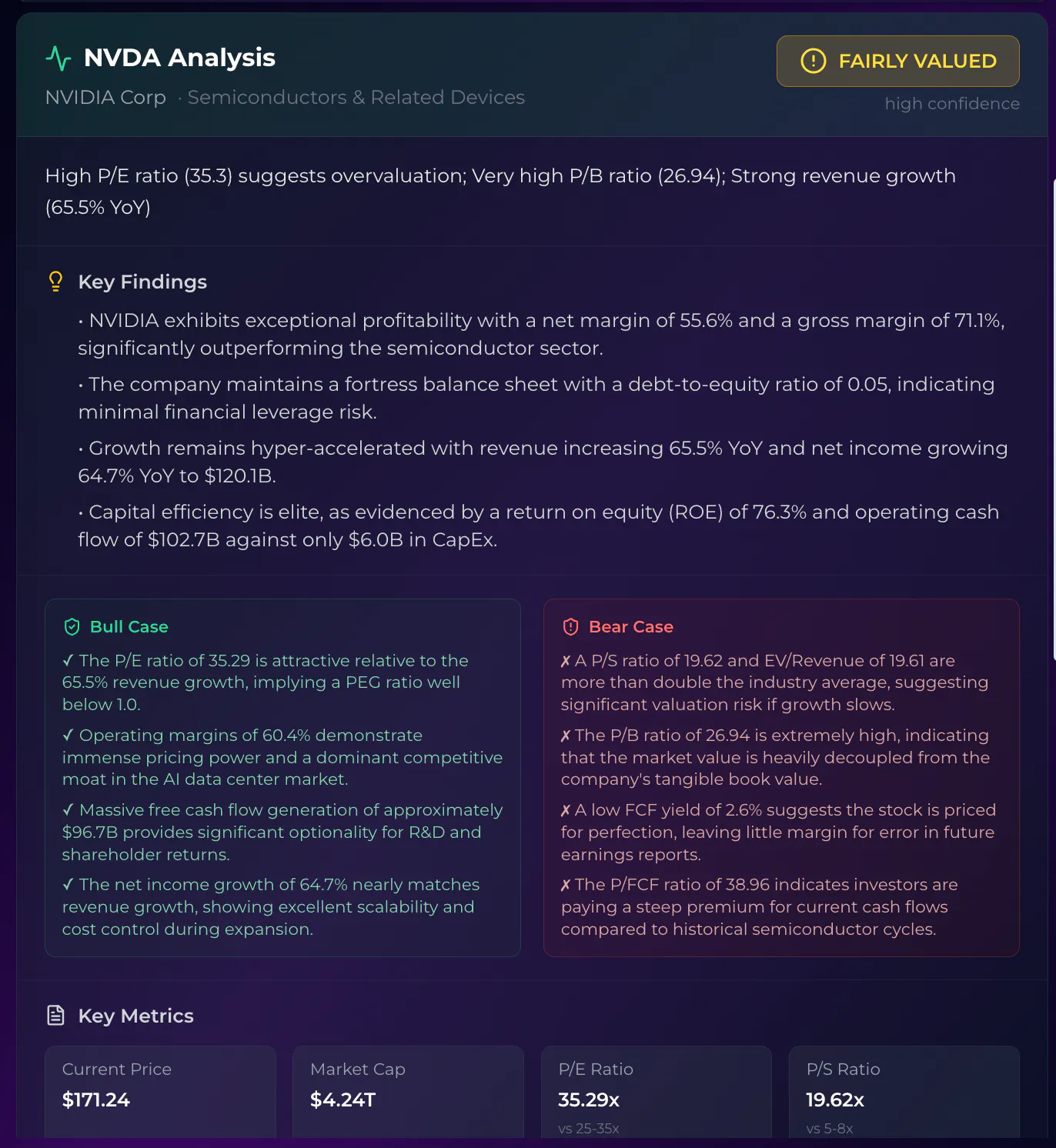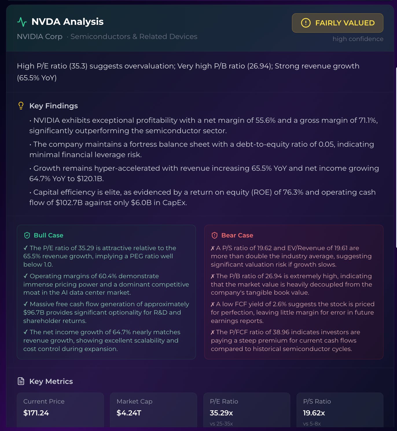 We ran NVDA through it. Verdict: fairly valued, high confidence.