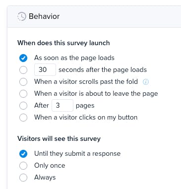 Wondering if the user behavior targeting includes delayed popup. Ex user has been reading a chatbot response for more than 20 seconds so we can ask them what they thought of the response