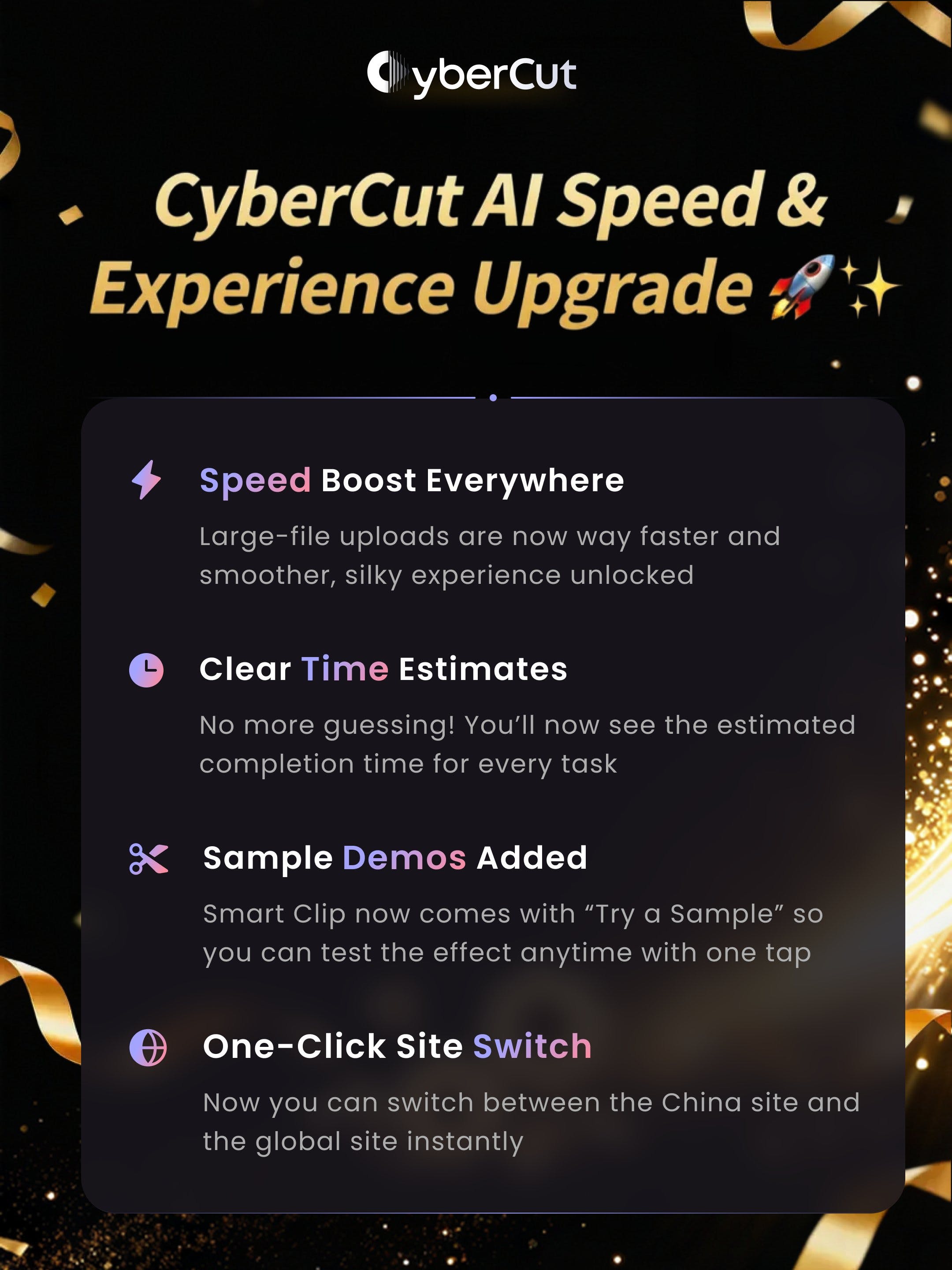 - One-Stop Platform: Because talking-head and marketing use cases share many needs, CyberCut aims to be a one-stop solution. That’s why we bring "Marketing Video" and "Smart Clip" together.