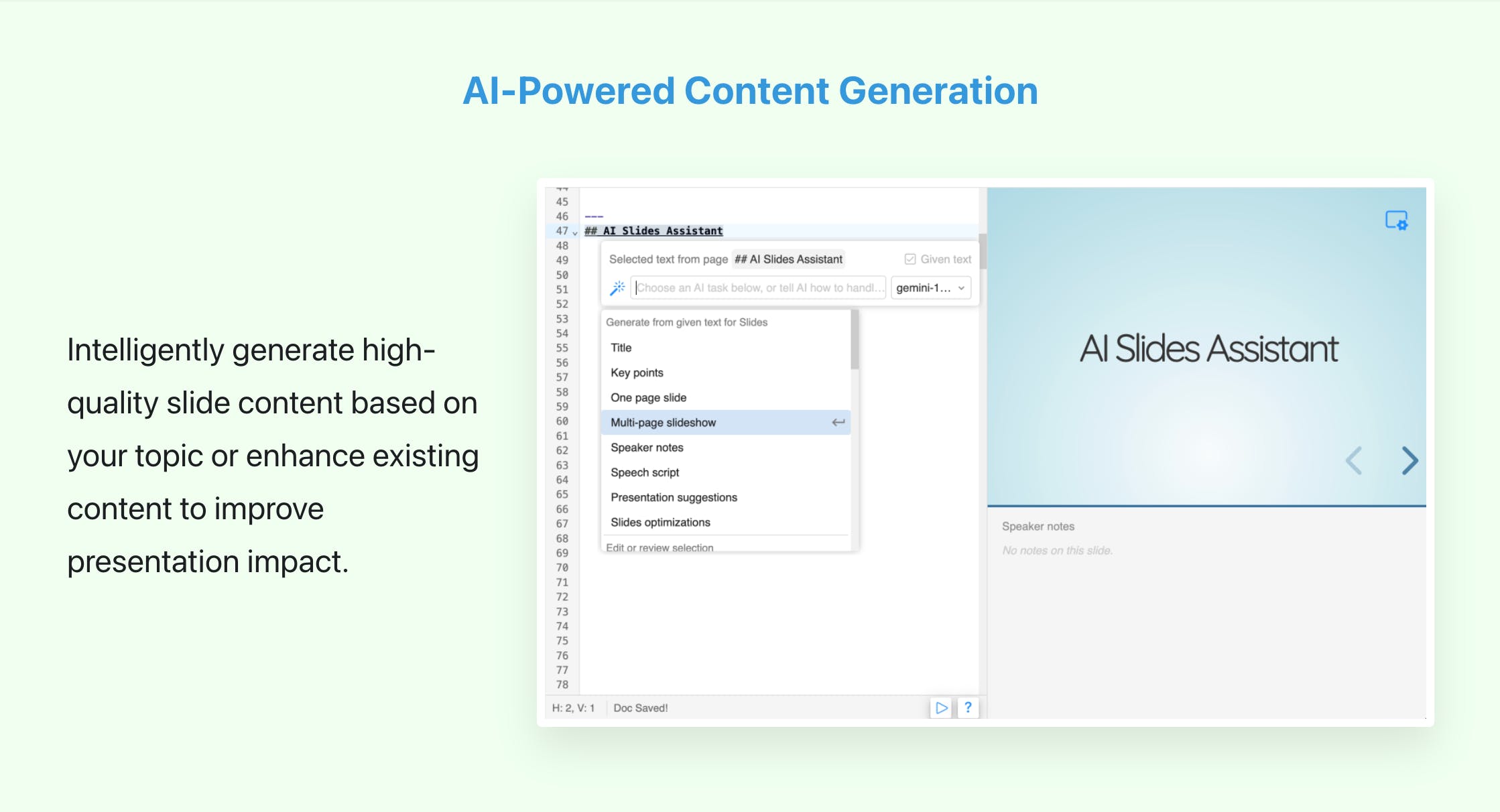 Seamless AI Agent Integration: On top of this flexible editing foundation, we've implemented a powerful AI agent capable of generating complete slides with a single click. This creates a perfect workflow where you can leverage AI for initial drafts or content enhancement, and then easily refine, modify, and perfect your presentation with the directness and efficiency of Markdown editing.