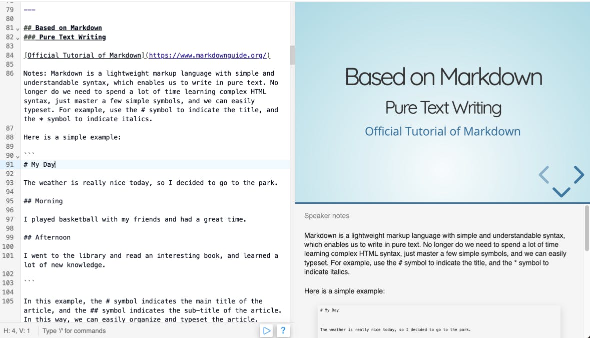 Markdown as the foundation. Instead of proprietary slide formats, we use Markdown. Anyone who's written documentation or blog posts knows how fast and intuitive Markdown can be. You get the directness of plain text with just enough formatting to create professional slides.