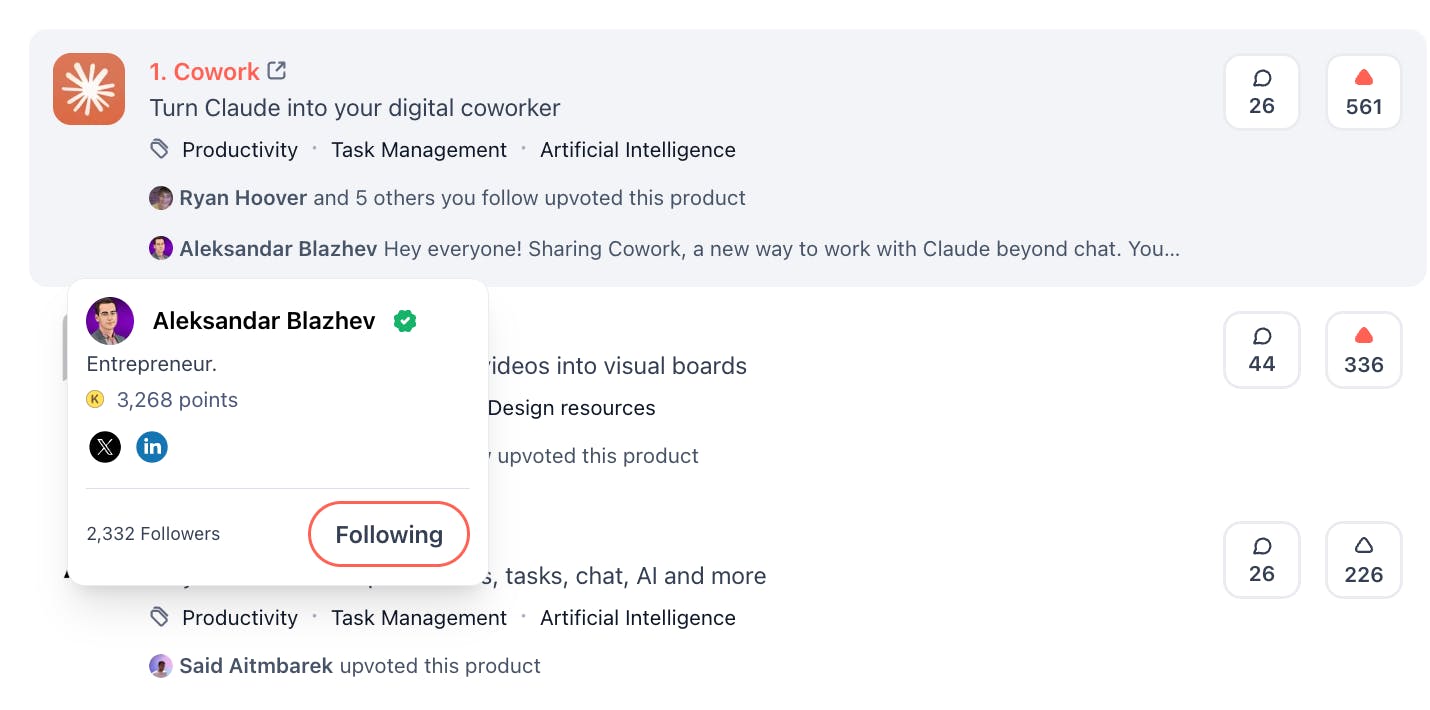 @seacat When I follow someone and this user upvotes a product or comments on it, I can see this action by looking at their profile photo. So it means for me that the person I trust (friend, follower) also uses the tool. It is like social proof.