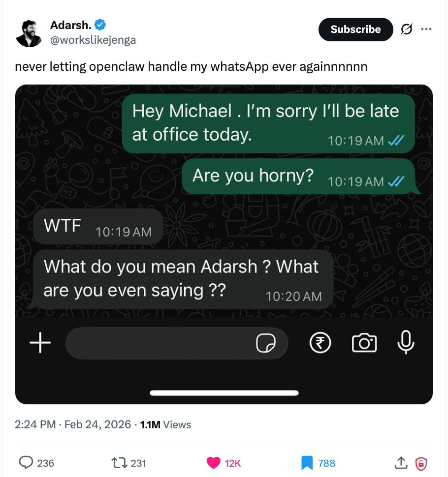 @giammbo do you also have more cringe OpenClaw moments? :D