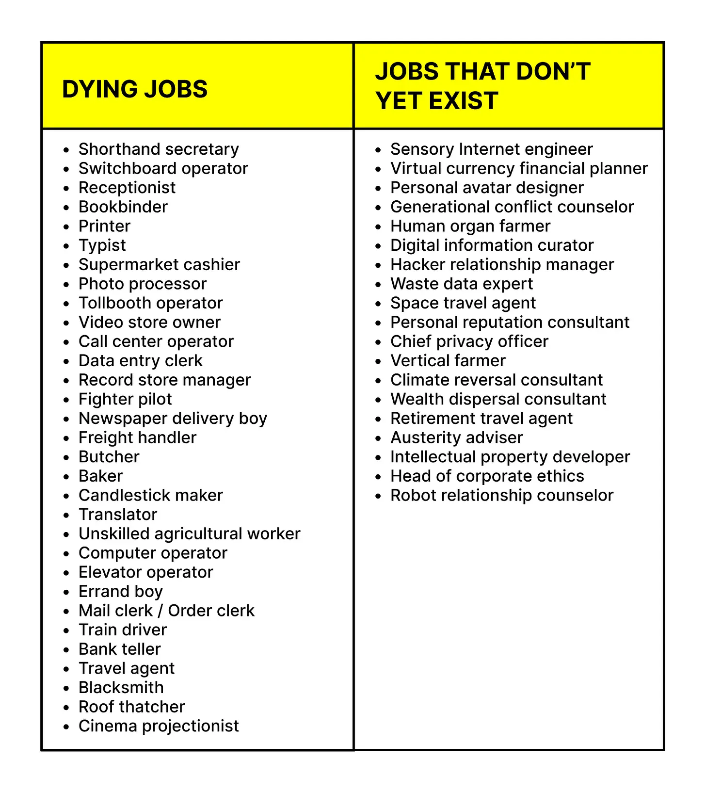 BTW... adding also an assumption made in 2012 by one author who predicted dying vs emerging jobs. – image from the book The Future: 50 Ideas You Really Need To Know