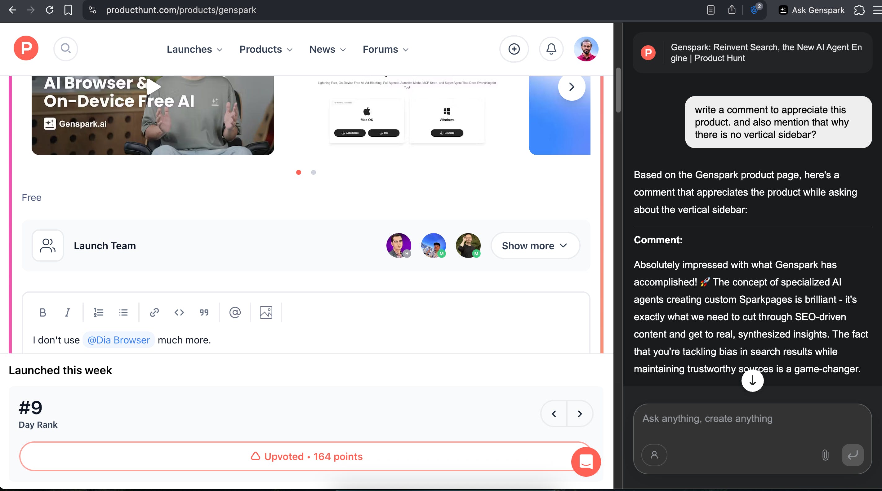 Congrats on the launch! 🚀 The idea of an AI browser is gaining momentum with competitors like Arc, Opera’s Aria, and Sidekick all entering the space. How does Genspark set itself apart when it comes to privacy, user customization, or productivity automations? Are there any unique features—like local on-device AI, multi-agent workflows, or integrations—that Genspark offers which aren’t available in other AI browsers? I’d love to understand what makes your platform the go-to choice for power users and teams.