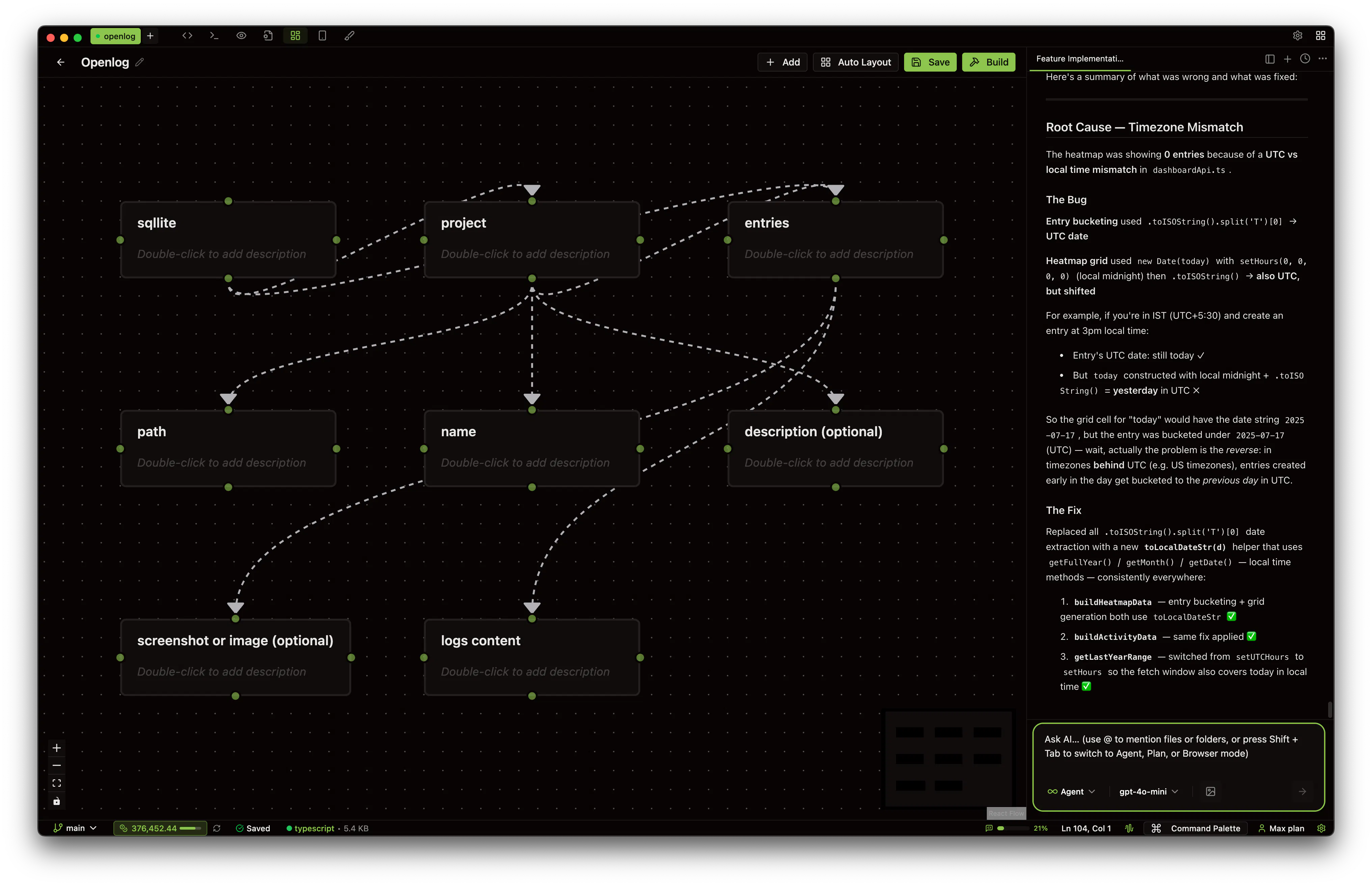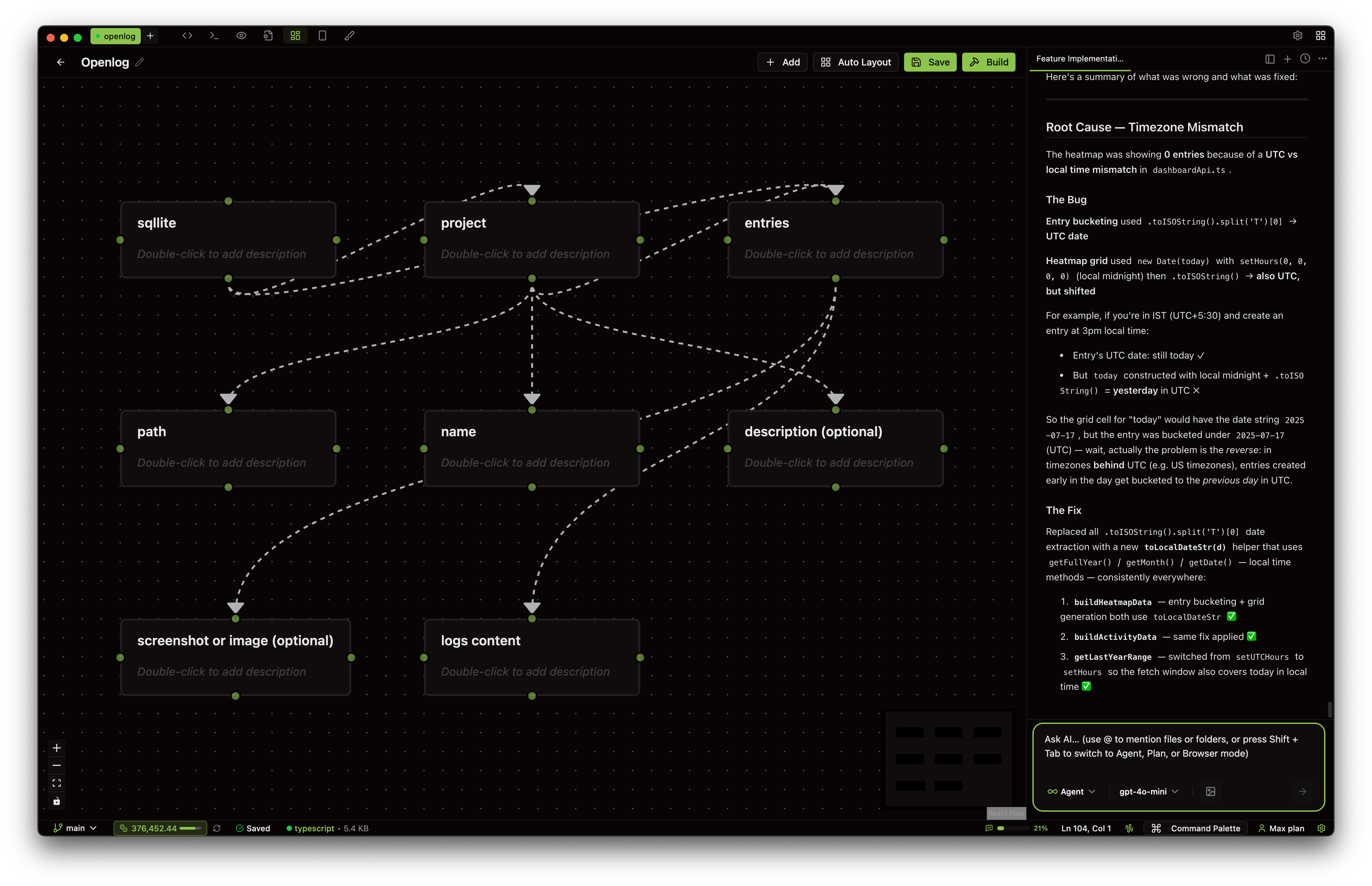 When your plan is ready, hit Build. The entire board — every feature, every connection, every file reference — gets sent to AI as a structured prompt. It reads the plan, respects the dependency order, and implements it.
