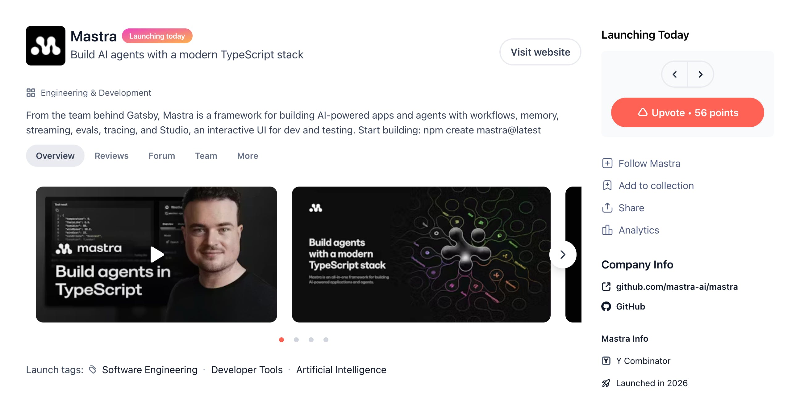 Image gallery: Product Hunt recommends adding 3 or more images. We play-and-mixed with existing blocks from mastra.ai for consistency.