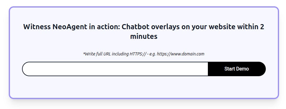 Go to app.neoagent.co and enter your website. You'll see a demo page with a chatbot that uses your website's public information.