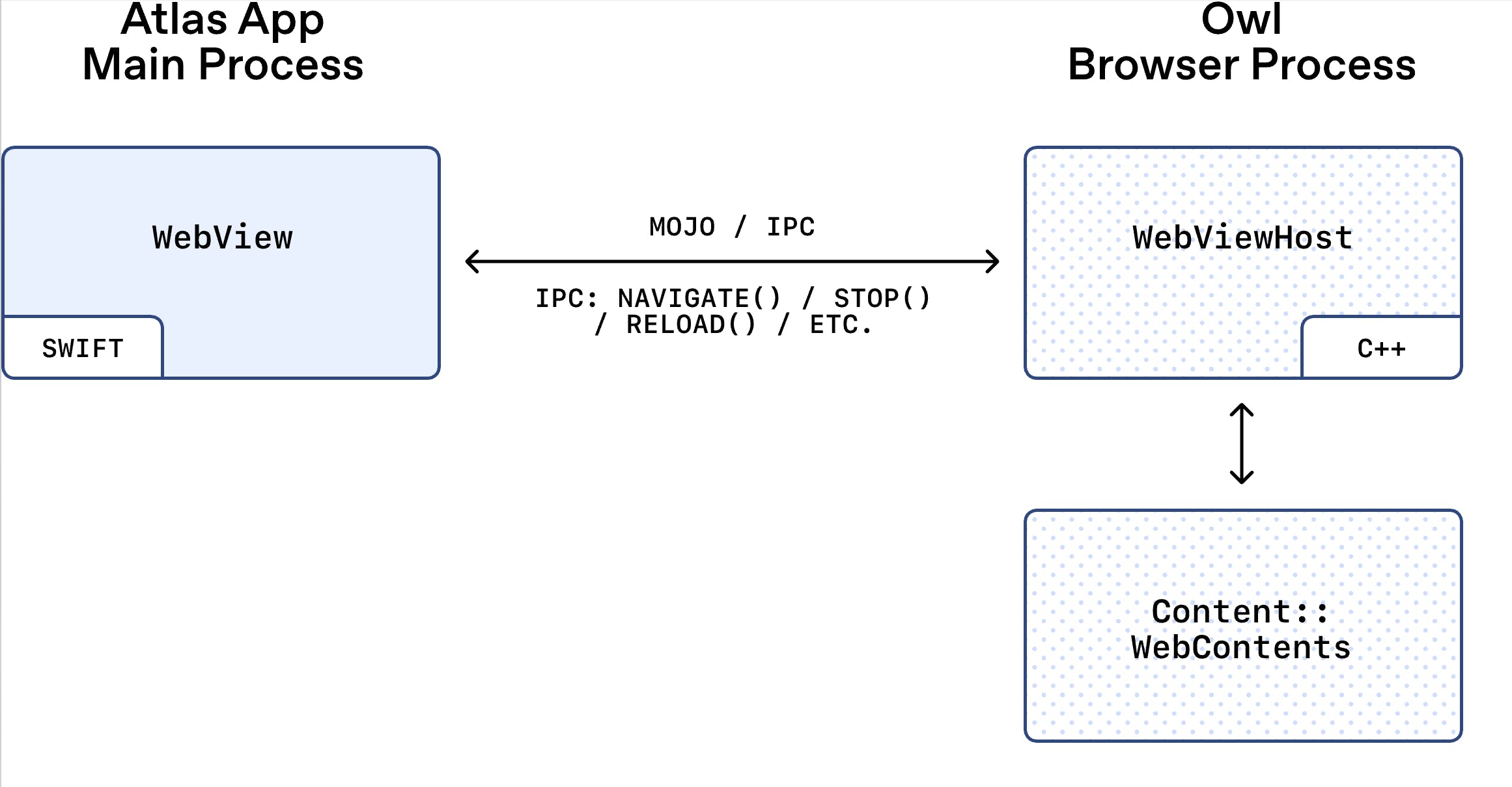 Atlas uses custom Swift and TypeScript bindings to communicate with Chromium through Mojo, Chromium's message-passing system