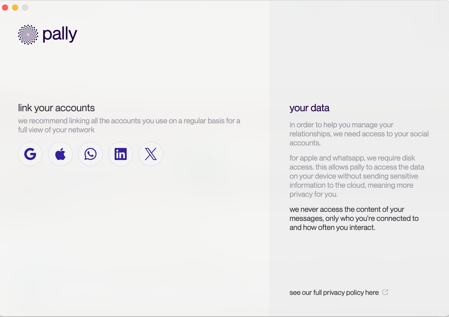 Pally sounds like a fantastic tool for anyone managing a large network! Given it pulls data from so many platforms (iMessage, WhatsApp, LinkedIn, etc.), I’m curious about privacy. How do you keep personal conversations and activity secure, and what controls do users have over what data is collected or stored? Thanks! 🔒🧐
