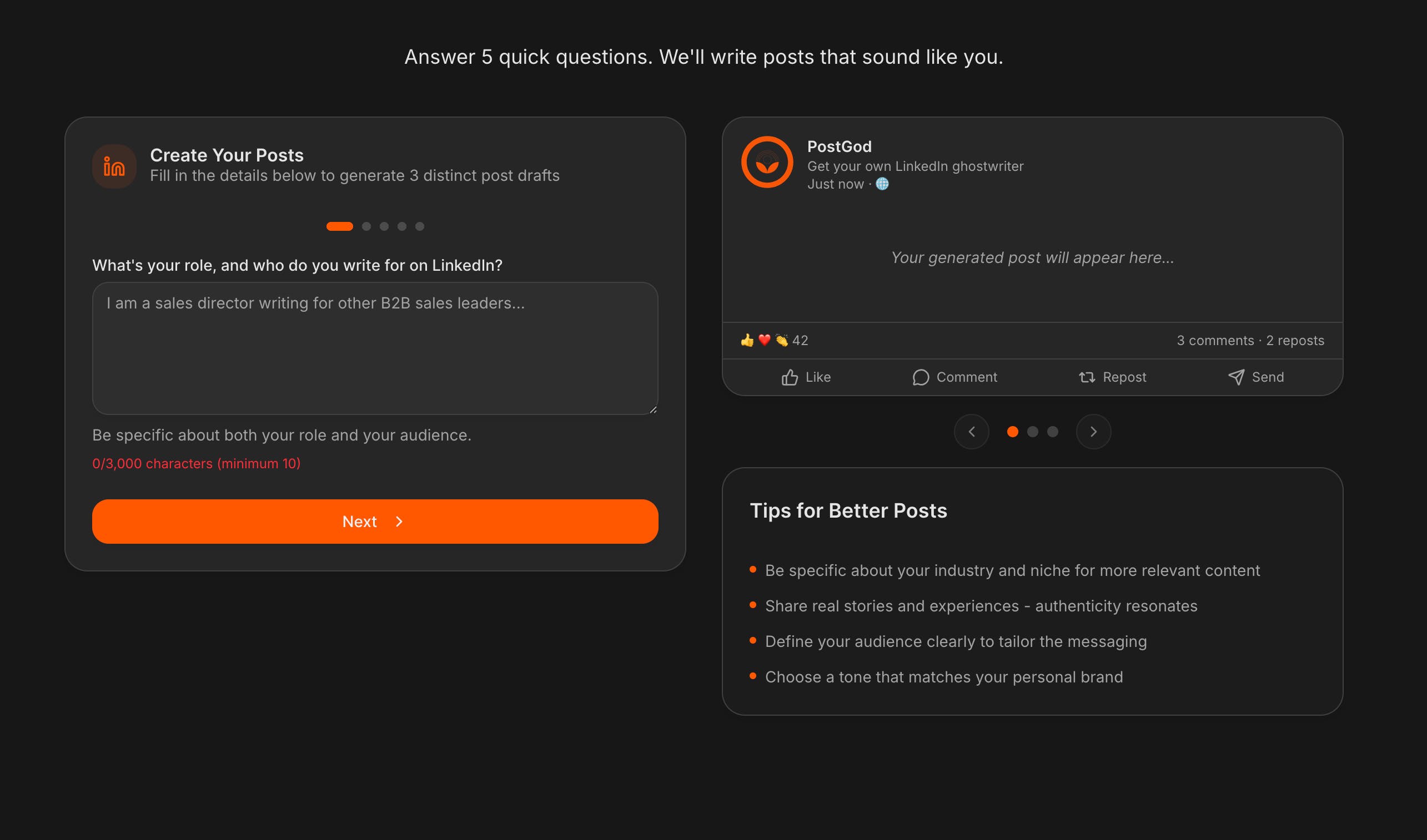 The initial version had a form with 5 questions outlined in a simple, straightforward way. The idea was simple: fill in the form, press generate, and see the posts. It was clear, but also... it didn't give you any visual cues or incentives.