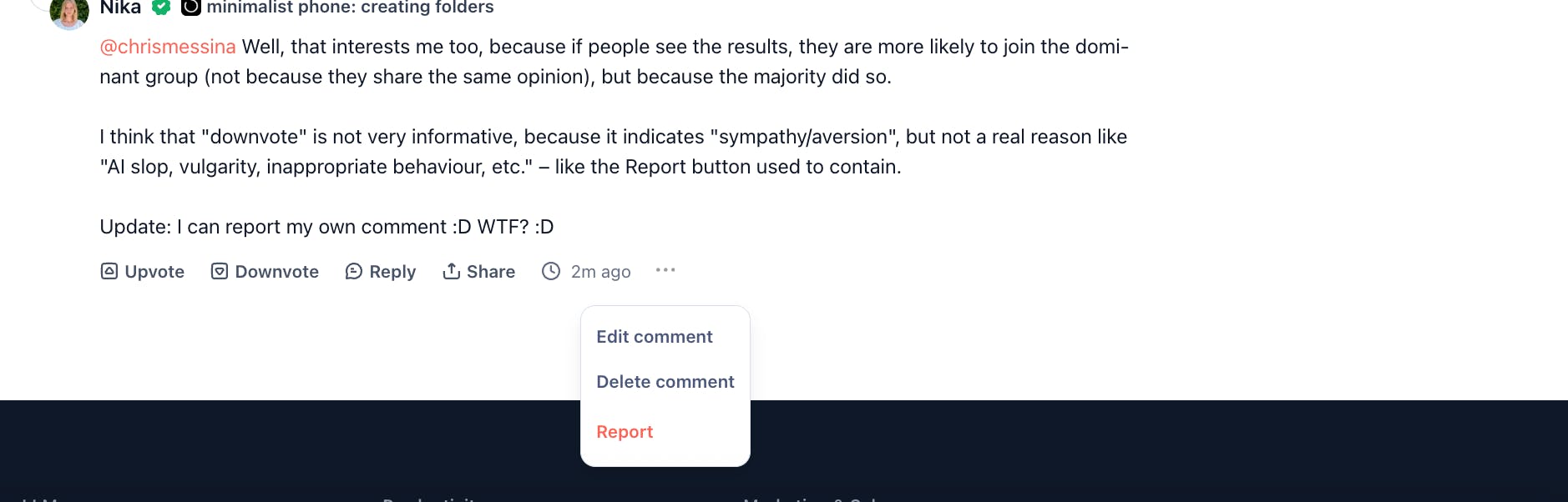 One thing I noticed about myself [UX/UI feedback]: I was so used to the "Upvote" and "Reply" buttons that I automatically tried to "Upvote" something and then press "Reply," which used to be next to the "Upvote." But instead, I ended up accidentally "Downvoting" my own "Upvote" with this new addition/replacement. 😅