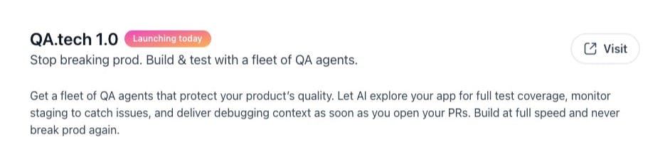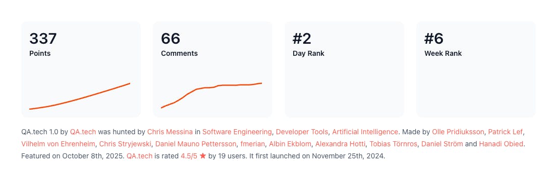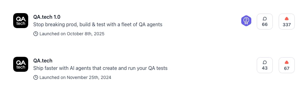 @QA.tech first launched on Product Hunt in 2024. On October 8, 2025, they announced 1.0.